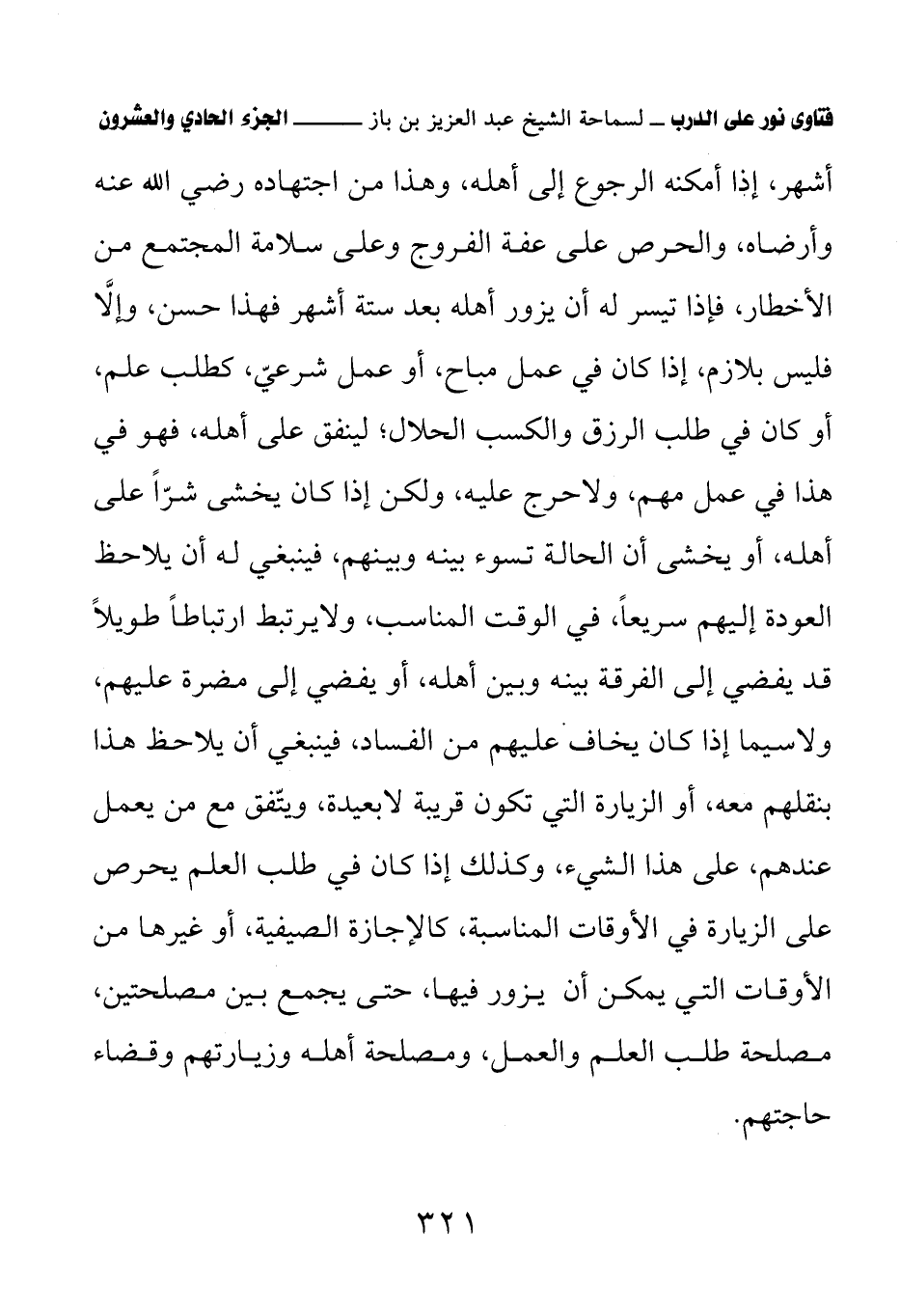 أشهر، إذا أمكنه الرجوع إلى أهله، وهذا من اجتهاده رضي الله عنه وأرضاه، والحرص على عفة الفروج وعلى سلامة المجتمع من الأخطار، فإذا تيسر له أن يزور أهله بعد ستة أشهر فهذا حسن، وإلا فليس بلازم، إذا كان في عمل مباح، أو عمل شرعي، كطلب علم، أو كان في طلب الرزق والكسب الحلال؛ لينفق على أهله، فهو في هذا في عمل مهم، ولا حرج عليه، ولكن إذا كان يخشى شرا على أهله، أو يخشى أن الحالة تسوء بينه وبينهم، فينبغي له أن يلاحظ العودة إليهم سريعا، في الوقت المناسب، ولا يرتبط ارتباطا طويلا قد يفضي إلى الفرقة بينه وبين أهله، أو يفضي إلى مضرة عليهم، ولا سيما إذا كان يخاف عليهم من الفساد، فينبغي أن يلاحظ هذا بنقلهم معه، أو الزيارة التي تكون قريبة لا بعيدة، ويتفق مع من يعمل عندهم، على هذا الشيء، وكذلك إذا كان في طلب العلم يحرص على الزيارة في الأوقات المناسبة، كالإجازة الصيفية، أو غيرها من الأوقات التي يمكن أن يزور فيها، حتى يجمع بين مصلحتين، مصلحة طلب العلم والعمل، ومصلحة أهله وزيارتهم وقضاء حاجتهم.