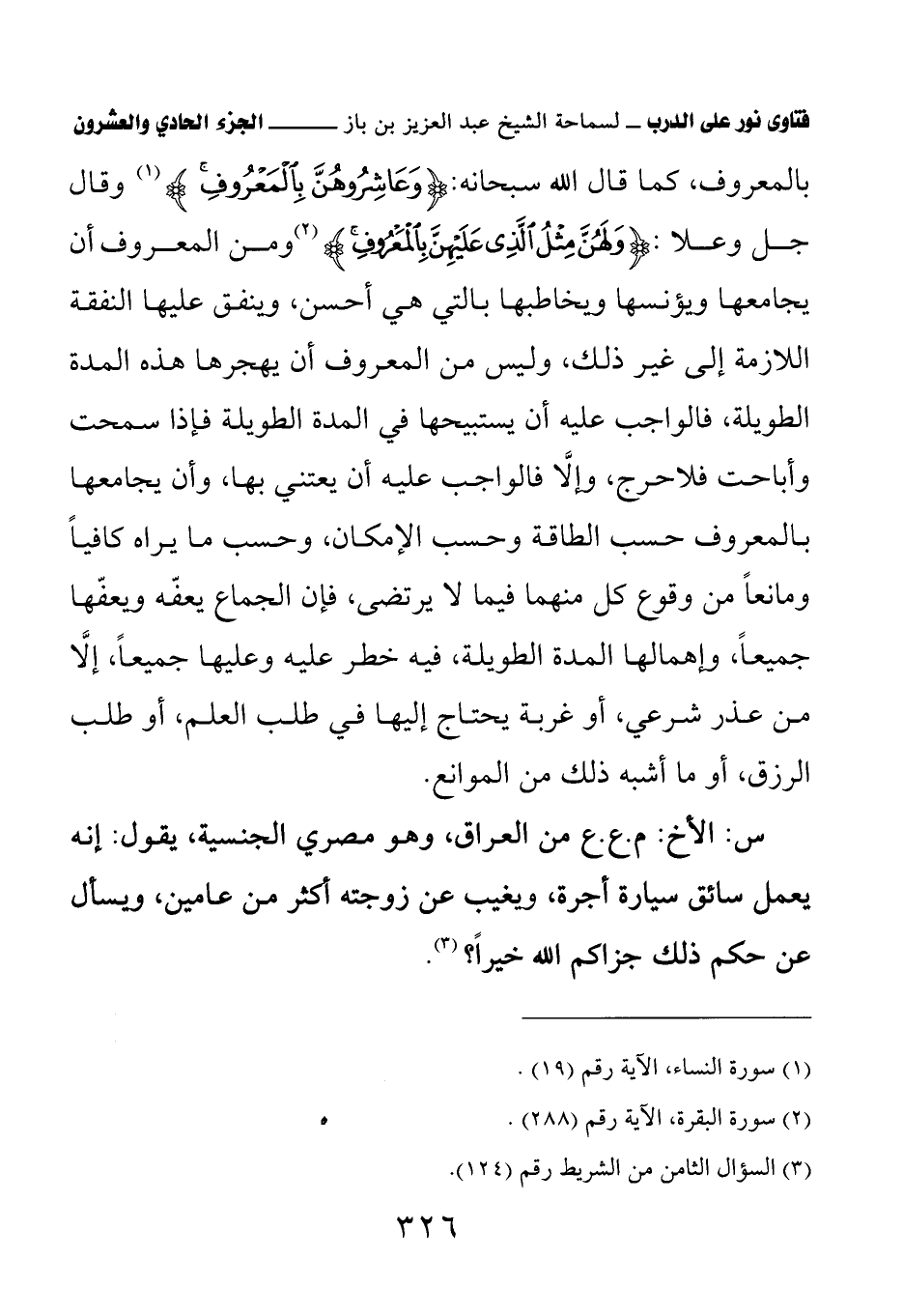 س: الأخ: م. ع. ع. من العراق، وهو مصري الجنسية، يقول: إنه يعمل سائق سيارة أجرة، ويغيب عن زوجته أكثر من عامين، ويسأل عن حكم ذلك جزاكم الله خيرا؟ (¬1)
