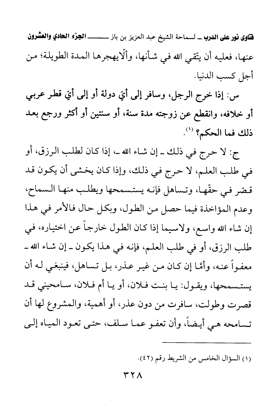 ج: لا حرج في ذلك- إن شاء الله- إذا كان لطلب الرزق، أو في طلب العلم، لا حرج في ذلك، وإذا كان يخشى أن يكون قد قصر في حقها، وتساهل فإنه يستسمحها ويطلب منها السماح، وعدم المؤاخذة فيما حصل من الطول، وبكل حال فالأمر في هذا إن شاء الله واسع، ولا سيما إذا كان الطول خارجا عن اختياره، في طلب الرزق، أو في طلب العلم، فإنه في هذا يكون- إن شاء الله- معفوا عنه، وأما إن كان من غير عذر، بل تساهل، فينبغي له أن يستسمحها، ويقول: يا بنت فلان، أو يا أم فلان، سامحيني قد قصرت وطولت، سافرت من دون عذر، أو أهمية، والمشروع لها أن تسامحه هي أيضا، وأن تعفو عما سلف، حتى تعود المياه إلى