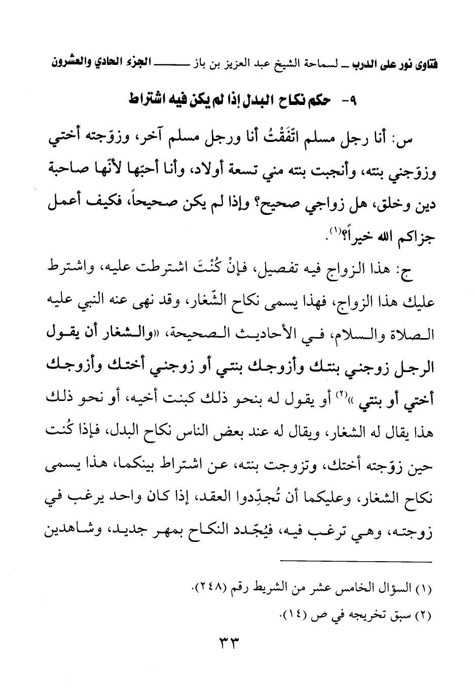 ج: هذا الزواج فيه تفصيل، فإن كنت اشترطت عليه، واشترط عليك هذا الزواج، فهذا يسمى نكاح الشغار، وقد نهى عنه النبي عليه الصلاة والسلام، في الأحاديث الصحيحة، «والشغار أن يقول الرجل زوجني بنتك وأزوجك بنتي أو زوجني أختك وأزوجك أختي أو بنتي» (¬2) أو يقول له بنحو ذلك كبنت أخيه، أو نحو ذلك هذا يقال له الشغار، ويقال له عند بعض الناس نكاح البدل، فإذا كنت حين زوجته أختك، وتزوجت بنته، عن اشتراط بينكما، هذا يسمى نكاح الشغار، وعليكما أن تجددوا العقد، إذا كان واحد يرغب في زوجته، وهي ترغب فيه، فيجدد النكاح بمهر جديد، وشاهدين