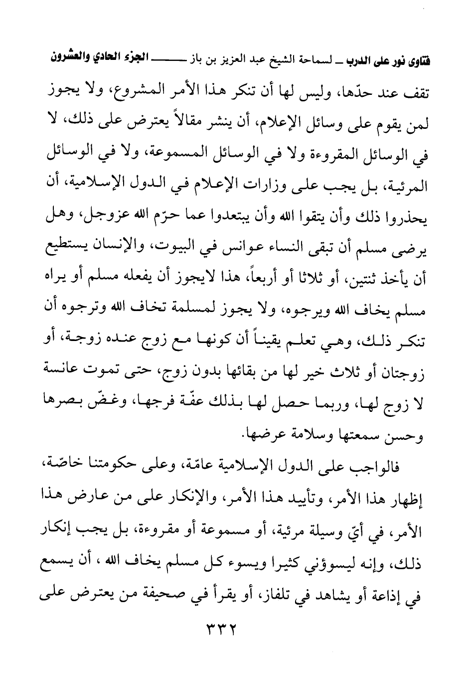 تقف عند حدها، وليس لها أن تنكر هذا الأمر المشروع، ولا يجوز لمن يقوم على وسائل الإعلام، أن ينشر مقالا يعترض على ذلك، لا في الوسائل المقروءة، ولا في الوسائل المسموعة، ولا في الوسائل المرئية، بل يجب على وزارات الإعلام في الدول الإسلامية، أن يحذروا ذلك وأن يتقوا الله وأن يبتعدوا عما حرم الله عز وجل، وهل يرضى مسلم أن تبقى النساء عوانس في البيوت، والإنسان يستطيع أن يأخذ ثنتين، أو ثلاثا أو أربعا، هذا لا يجوز أن يفعله مسلم أو يراه مسلم يخاف الله ويرجوه، ولا يجوز لمسلمة تخاف الله وترجوه أن تنكر ذلك، وهي تعلم يقينا أن كونها مع زوج عنده زوجة، أو زوجتان أو ثلاث خير لها من بقائها بدون زوج، حتى تموت عانسة لا زوج لها، وربما حصل لها بذلك عفة فرجها، وغض بصرها وحسن سمعتها وسلامة عرضها.