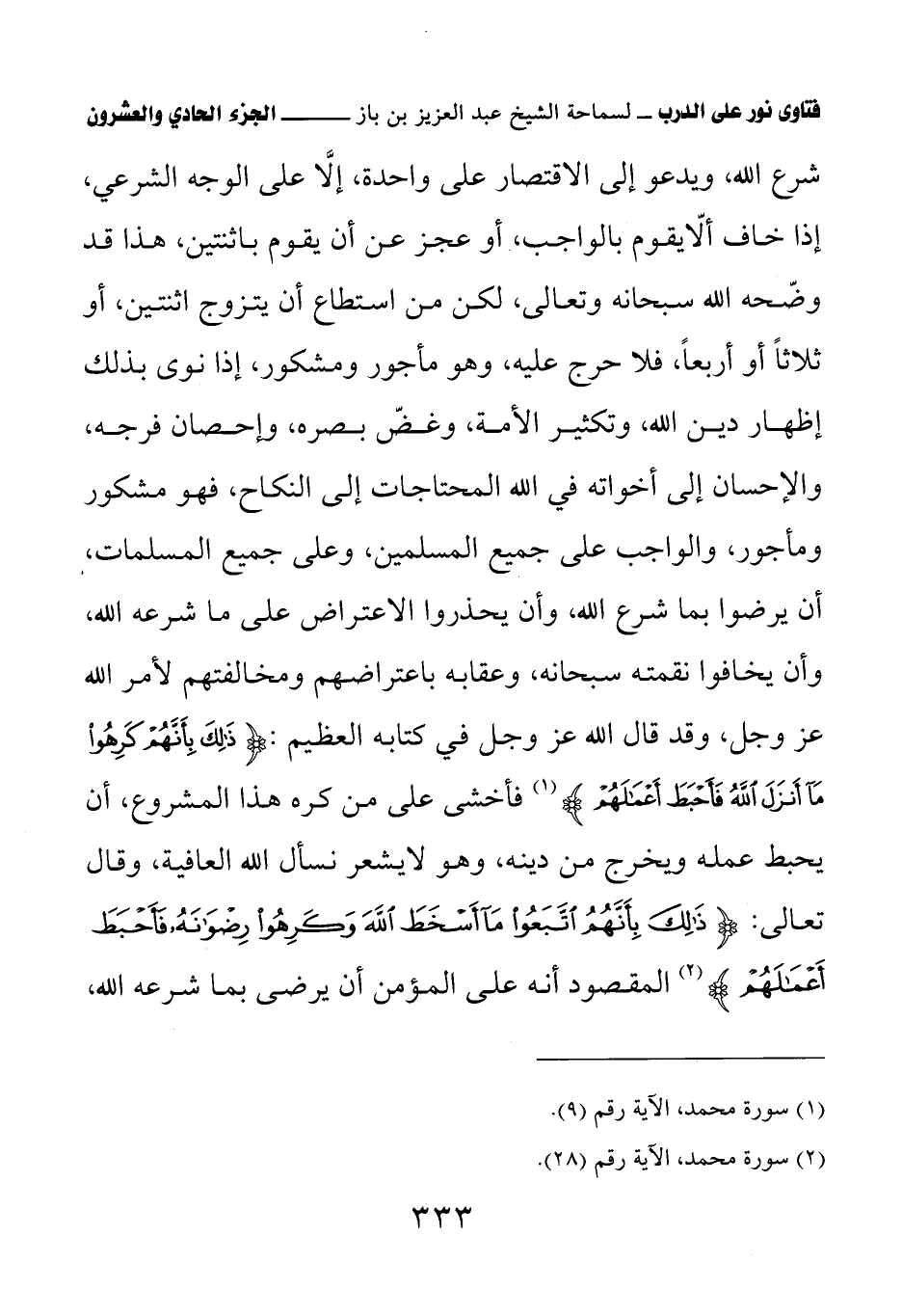 شرع الله، ويدعو إلى الاقتصار على واحدة، إلا على الوجه الشرعي، إذا خاف ألا يقوم بالواجب، أو عجز عن أن يقوم باثنتين، هذا قد وضحه الله سبحانه وتعالى، لكن من استطاع أن يتزوج اثنتين، أو ثلاثا أو أربعا، فلا حرج عليه، وهو مأجور ومشكور، إذا نوى بذلك إظهار دين الله، وتكثير الأمة، وغض بصره، وإحصان فرجه، والإحسان إلى أخواته في الله المحتاجات إلى النكاح، فهو مشكور ومأجور، والواجب على جميع المسلمين، وعلى جميع المسلمات، أن يرضوا بما شرع الله، وأن يحذروا الاعتراض على ما شرعه الله، وأن يخافوا نقمته سبحانه، وعقابه باعتراضهم ومخالفتهم لأمر الله عز وجل، وقد قال الله عز وجل في كتابه العظيم: {ذَلِكَ بِأَنَّهُمْ كَرِهُوا مَا أَنْزَلَ اللَّهُ فَأَحْبَطَ أَعْمَالَهُمْ} فأخشى على من كره هذا المشروع، أن يحبط عمله ويخرج من دينه، وهو لا يشعر نسأل الله العافية، وقال تعالى: {ذَلِكَ بِأَنَّهُمُ اتَّبَعُوا مَا أَسْخَطَ اللَّهَ وَكَرِهُوا رِضْوَانَهُ فَأَحْبَطَ أَعْمَالَهُمْ} المقصود أنه على المؤمن أن يرضى بما شرعه الله،