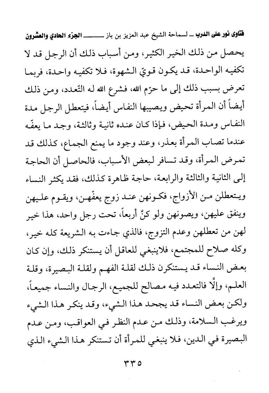 يحصل من ذلك الخير الكثير، ومن أسباب ذلك أن الرجل قد لا تكفيه الواحدة، قد يكون قوي الشهوة، فلا تكفيه واحدة، فربما تعرض بسبب ذلك إلى ما حرم الله، فشرع الله له التعدد، ومن ذلك أيضا أن المرأة تحيض ويصيبها النفاس أيضا، فيتعطل الرجل مدة النفاس ومدة الحيض، فإذا كان عنده ثانية وثالثة، وجد ما يعفه عندما تصاب المرأة بعذر، وعند وجود ما يمنع الجماع، كذلك قد تمرض المرأة، وقد تسافر لبعض الأسباب، فالحاصل أن الحاجة إلى الثانية والثالثة والرابعة، حاجة ظاهرة كذلك، فقد يكثر النساء ويتعطلن من الأزواج، فكونهن عند زوج يعفهن، ويقوم عليهن وينفق عليهن، ويصونهن ولو كن أربعا، تحت رجل واحد، هذا خير لهن من تعطلهن وعدم التزوج، فالذي جاءت به الشريعة كله خير، وكله صلاح للمجتمع، فلا ينبغي للعاقل أن يستنكر ذلك، وإن كان بعض النساء قد يستنكرن ذلك لقلة الفهم ولقلة البصيرة، وقلة العلم، وإلا فالتعدد فيه مصالح للجميع، الرجال والنساء جميعا، ولكن بعض النساء قد يجحد هذا الشيء، وقد ينكر هذا الشيء ويرغب السلامة، وذلك من عدم النظر في العواقب، ومن عدم البصيرة في الدين، فلا ينبغي للمرأة أن تستنكر هذا الشيء الذي