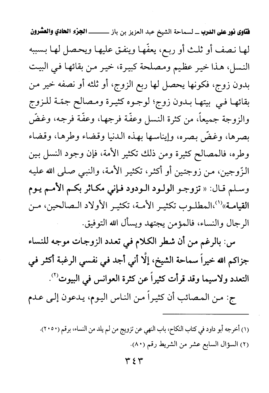 لها نصف أو ثلث أو ربع، يعفها وينفق عليها ويحصل لها بسببه النسل، هذا خير عظيم ومصلحة كبيرة، خير من بقائها في البيت بدون زوج، فكونها يحصل لها ربع الزوج، أو ثلثه أو نصفه خير من بقائها في بيتها بدون زوج؛ لوجوه كثيرة ومصالح جمة للزوج والزوجة جميعا، من كثرة النسل وعفة فرجها، وعفة فرجه، وغض بصرها، وغض بصره، وإيناسها بهذه الدنيا وقضاء وطرها، وقضاء وطره، فالمصالح كثيرة ومن ذلك تكثير الأمة، فإن وجود النسل بين الزوجين، من زوجتين أو أكثر، تكثير الأمة، والنبي صلى الله عليه وسلم قال: «تزوجوا الولود الودود فإني مكاثر بكم الأمم يوم القيامة» (¬1) المطلوب تكثير الأمة، تكثير الأولاد الصالحين، من الرجال والنساء، فالمؤمن يجتهد ويسأل الله التوفيق.