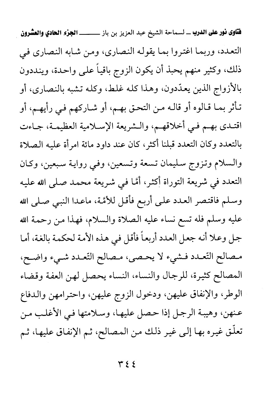 التعدد، وربما اغتروا بما يقوله النصارى، ومن شابه النصارى في ذلك، وكثير منهم يحبذ أن يكون الزوج باقيا على واحدة، وينددون بالأزواج الذين يعددون، وهذا كله غلط، وكله تشبه بالنصارى، أو تأثر بما قالوه أو قاله من التحق بهم، أو شاركهم في رأيهم، أو اقتدى بهم في أخلاقهم، والشريعة الإسلامية العظيمة، جاءت بالتعدد وكان التعدد قبلنا أكثر، كان عند داود مائة امرأة عليه الصلاة والسلام وتزوج سليمان تسعة وتسعين، وفي رواية سبعين، وكان التعدد في شريعة التوراة أكثر، أما في شريعة محمد صلى الله عليه وسلم فاقتصر العدد على أربع فأقل للأمة، ما عدا النبي صلى الله عليه وسلم فله تسع نساء عليه الصلاة والسلام، فهذا من رحمة الله جل وعلا أنه جعل العدد أربعا فأقل في هذه الأمة لحكمة بالغة، أما مصالح التعدد فشيء لا يحصى، مصالح التعدد شيء واضح، المصالح كثيرة، للرجال والنساء، النساء يحصل لهن العفة وقضاء الوطر، والإنفاق عليهن، ودخول الزوج عليهن، واحترامهن والدفاع عنهن، وهيبة الرجل إذا حصل عليها، وسلامتها في الأغلب من تعلق غيره بها إلى غير ذلك من المصالح، ثم الإنفاق عليها، ثم