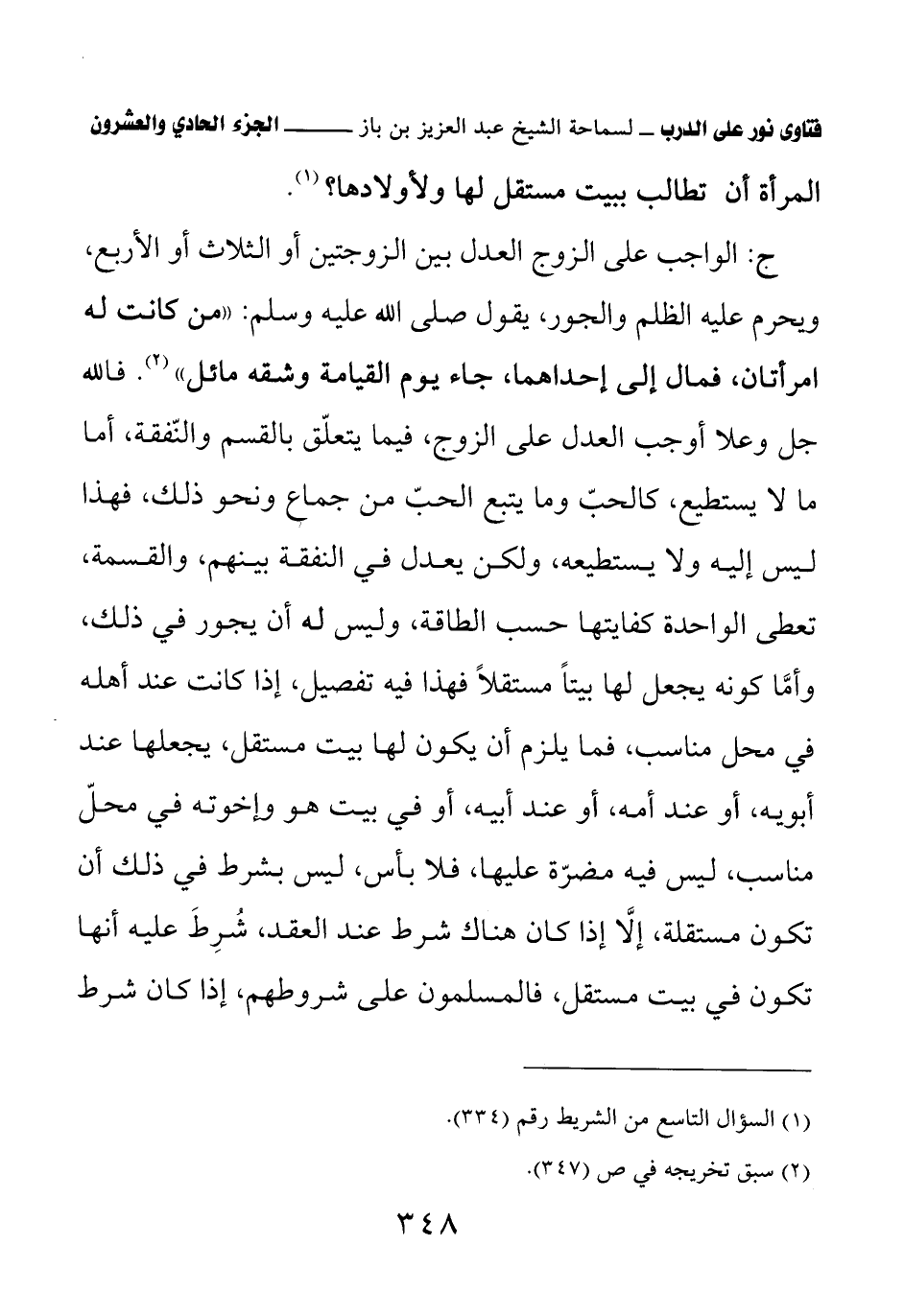 ج: الواجب على الزوج العدل بين الزوجتين أو الثلاث أو الأربع، ويحرم عليه الظلم والجور، يقول صلى الله عليه وسلم: «من كانت له امرأتان، فمال إلى إحداهما، جاء يوم القيامة وشقه مائل» (¬2) فالله جل وعلا أوجب العدل على الزوج، فيما يتعلق بالقسم والنفقة، أما ما لا يستطيع، كالحب وما يتبع الحب من جماع ونحو ذلك، فهذا ليس إليه ولا يستطيعه، ولكن يعدل في النفقة بينهم، والقسمة، تعطى الواحدة كفايتها حسب الطاقة، وليس له أن يجور في ذلك، وأما كونه يجعل لها بيتا مستقلا فهذا فيه تفصيل، إذا كانت عند أهله في محل مناسب، فما يلزم أن يكون لها بيت مستقل، يجعلها عند أبويه، أو عند أمه، أو عند أبيه، أو في بيت هو وإخوته في محل مناسب، ليس فيه مضرة عليها، فلا بأس، ليس بشرط في ذلك أن تكون مستقلة، إلا إذا كان هناك شرط عند العقد، شرط عليه أنها تكون في بيت مستقل، فالمسلمون على شروطهم، إذا كان شرط