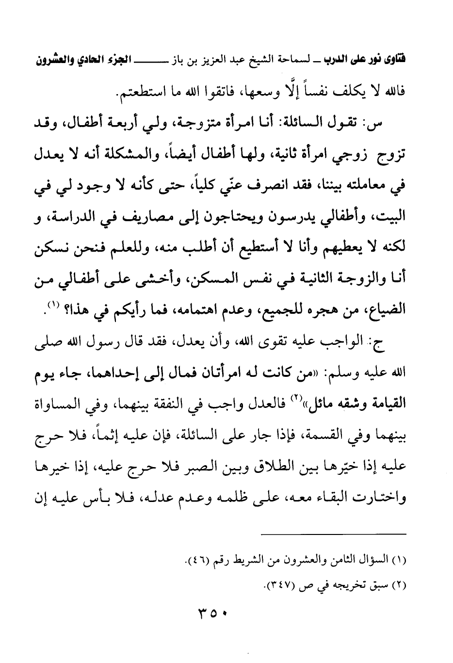 ج: الواجب عليه تقوى الله، وأن يعدل، فقد قال صلى الله عليه وسلم: «من كانت له امرأتان فمال إلى إحداهما، جاء يوم القيامة وشقه مائل» (¬2) فالعدل واجب في النفقة بينهما، وفي المساواة بينهما وفي القسمة، فإذا جار على السائلة، فإن عليه إثما، فلا حرج عليه إذا خيرها بين الطلاق وبين الصبر فلا حرج عليه، إذا خيرها واختارت البقاء معه، على ظلمه وعدم عدله، فلا بأس عليه إن