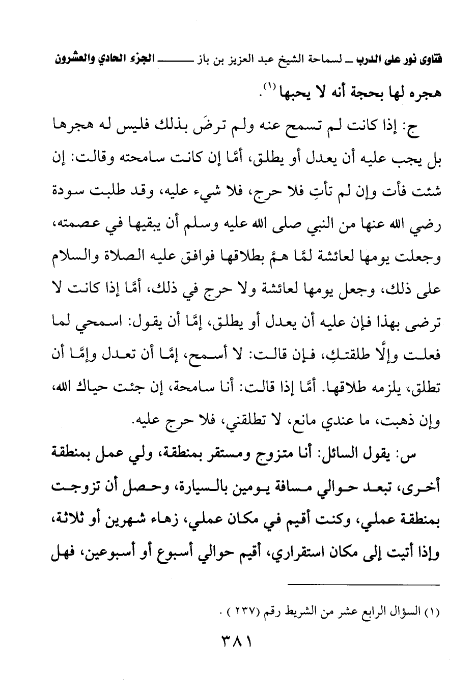 ج: إذا كانت لم تسمح عنه ولم ترض بذلك فليس له هجرها بل يجب عليه أن يعدل أو يطلق، أما إن كانت سامحته وقالت: إن شئت فأت وإن لم تأت فلا حرج، فلا شيء عليه، وقد طلبت سودة رضي الله عنها من النبي صلى الله عليه وسلم أن يبقيها في عصمته، وجعلت يومها لعائشة لما هم بطلاقها فوافق عليه الصلاة والسلام على ذلك، وجعل يومها لعائشة ولا حرج في ذلك، أما إذا كانت لا ترضى بهذا فإن عليه أن يعدل أو يطلق، إما أن يقول: اسمحي لما فعلت وإلا طلقتك، فإن قالت: لا أسمح، إما أن تعدل وإما أن تطلق، يلزمه طلاقها. أما إذا قالت: أنا سامحة، إن جئت حياك الله، وإن ذهبت، ما عندي مانع، لا تطلقني، فلا حرج عليه.