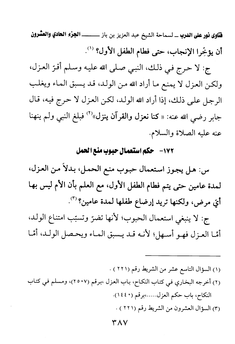 ج: لا حرج في ذلك، النبي صلى الله عليه وسلم أقر العزل، ولكن العزل لا يمنع ما أراد الله من الولد، قد يسبق الماء ويغلب الرجل على ذلك، إذا أراد الله الولد، لكن العزل لا حرج فيه، قال جابر رضي الله عنه: «كنا نعزل والقرآن ينزل» (¬2) فبلغ النبي ولم ينهنا عنه عليه الصلاة والسلام.