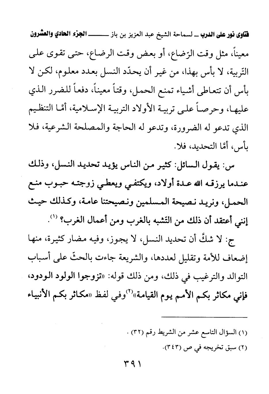 ج: لا شك أن تحديد النسل، لا يجوز، وفيه مضار كثيرة، منها إضعاف للأمة وتقليل لعددها، والشريعة جاءت بالحث على أسباب التوالد والترغيب في ذلك، ومن ذلك قوله: «تزوجوا الولود الودود، فإني مكاثر بكم الأمم يوم القيامة» (¬2) وفي لفظ: «مكاثر بكم الأنبياء