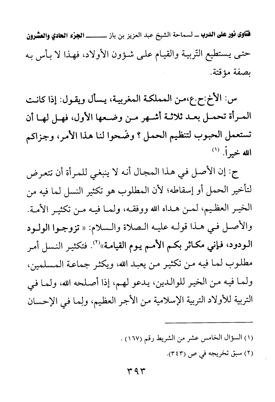 والأصل في هذا قوله عليه الصلاة والسلام: «تزوجوا الولود الودود، فإني مكاثر بكم الأمم يوم القيامة» (¬2) فتكثير النسل أمر مطلوب لما فيه من تكثير من يعبد الله، ويكثر جماعة المسلمين، ولما فيه من الخير للوالدين، يدعو لهم، إذا أصلحه الله، ولما في التربية للأولاد التربية الإسلامية من الأجر العظيم، ولما في الإحسان