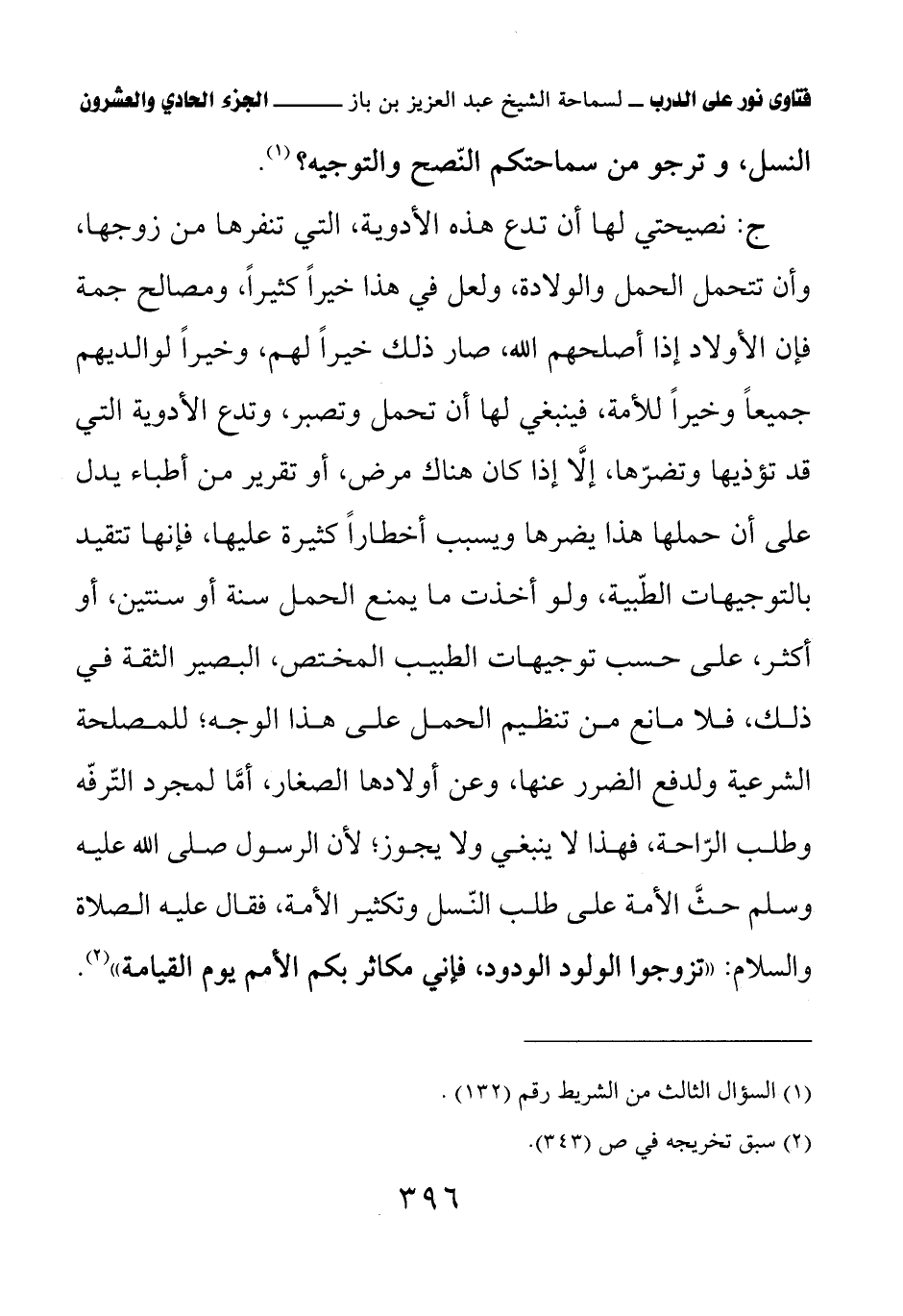 ج: نصيحتي لها أن تدع هذه الأدوية، التي تنفرها من زوجها، وأن تتحمل الحمل والولادة، ولعل في هذا خيرا كثيرا، ومصالح جمة فإن الأولاد إذا أصلحهم الله، صار ذلك خيرا لهم، وخيرا لوالديهم جميعا وخيرا للأمة، فينبغي لها أن تحمل وتصبر، وتدع الأدوية التي قد تؤذيها وتضرها، إلا إذا كان هناك مرض، أو تقرير من أطباء يدل على أن حملها هذا يضرها ويسبب أخطارا كثيرة عليها، فإنها تتقيد بالتوجيهات الطبية، ولو أخذت ما يمنع الحمل سنة أو سنتين، أو أكثر، على حسب توجيهات الطبيب المختص، البصير الثقة في ذلك، فلا مانع من تنظيم الحمل على هذا الوجه؛ للمصلحة الشرعية ولدفع الضرر عنها، وعن أولادها الصغار، أما لمجرد الترفه وطلب الراحة، فهذا لا ينبغي ولا يجوز؛ لأن الرسول صلى الله عليه وسلم حث الأمة على طلب النسل وتكثير الأمة، فقال عليه الصلاة والسلام: «تزوجوا الولود الودود، فإني مكاثر بكم الأمم يوم القيامة» (¬2)