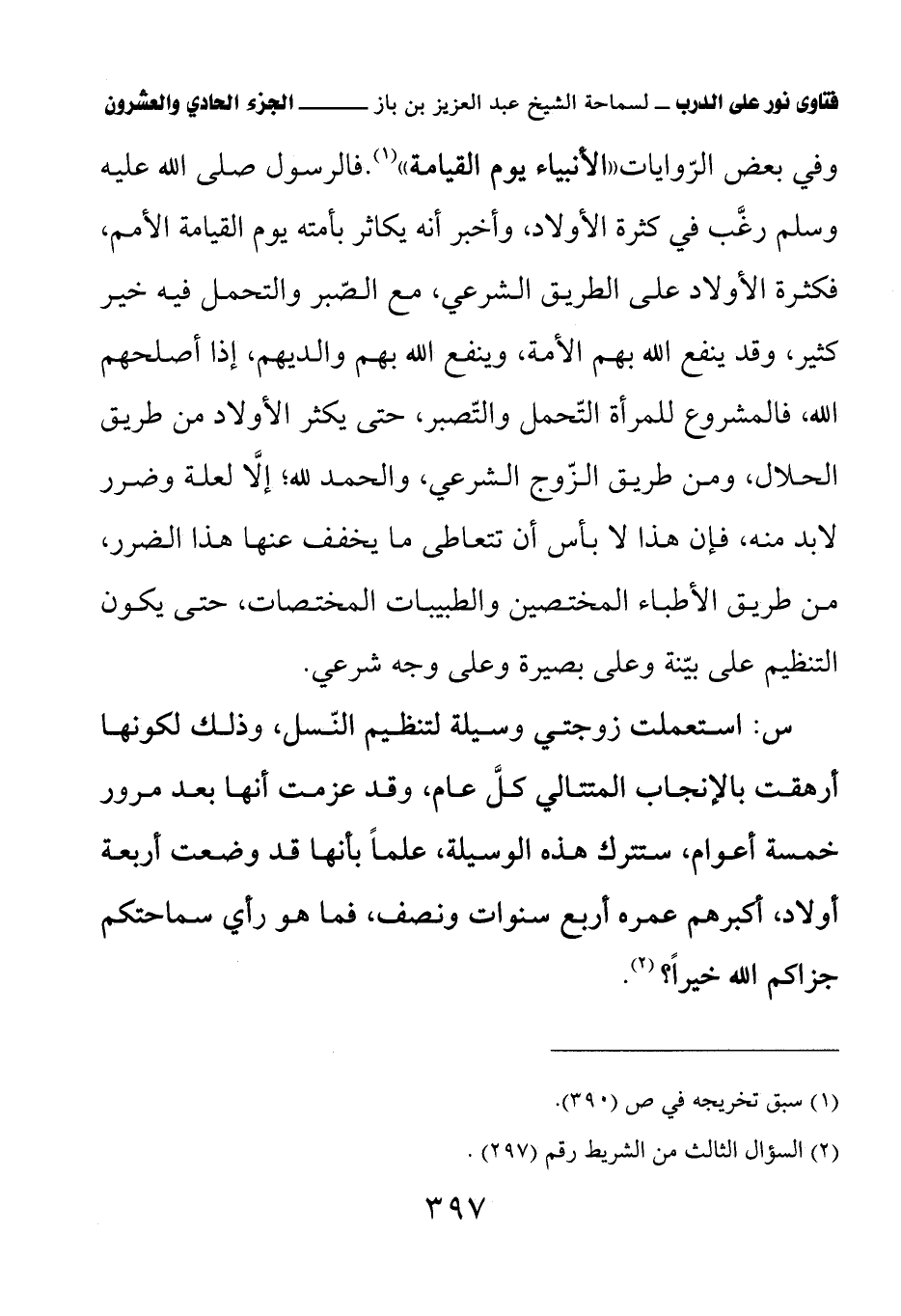 وفي بعض الروايات «الأنبياء يوم القيامة» (¬1) فالرسول صلى الله عليه وسلم رغب في كثرة الأولاد، وأخبر أنه يكاثر بأمته يوم القيامة الأمم، فكثرة الأولاد على الطريق الشرعي، مع الصبر والتحمل فيه خير كثير، وقد ينفع الله بهم الأمة، وينفع الله بهم والديهم، إذا أصلحهم الله، فالمشروع للمرأة التحمل والتصبر، حتى يكثر الأولاد من طريق الحلال، ومن طريق الزوج الشرعي، والحمد لله؛ إلا لعلة وضرر لا بد منه، فإن هذا لا بأس أن تتعاطى ما يخفف عنها هذا الضرر، من طريق الأطباء المختصين والطبيبات المختصات، حتى يكون التنظيم على بينة وعلى بصيرة وعلى وجه شرعي.