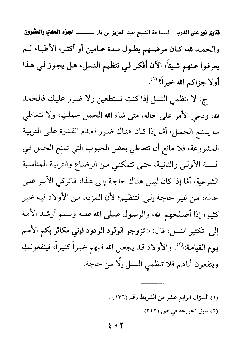 ج: لا تنظمي النسل إذا كنت تستطيعين ولا ضرر عليك فالحمد لله، ودعي الأمر على حاله، متى شاء الله الحمل حملت، ولا تتعاطي ما يمنع الحمل، أما إذا كان هناك ضرر لعدم القدرة على التربية المشروعة، فلا مانع أن تتعاطي بعض الحبوب التي تمنع الحمل في السنة الأولى والثانية، حتى تتمكني من الرضاع والتربية المناسبة الشرعية، أما إذا كان ليس هناك حاجة إلى هذا، فاتركي الأمر على حاله، من غير حاجة إلى التنظيم؛ لأن المزيد من الأولاد فيه خير كثير، إذا أصلحهم الله، والرسول صلى الله عليه وسلم أرشد الأمة إلى تكثير النسل، قال: «تزوجوا الولود الودود، فإني مكاثر بكم الأمم يوم القيامة» (¬2) والأولاد قد يجعل الله فيهم خيرا كثيرا، فينفعونك وينفعون أباهم فلا تنظمي النسل إلا من حاجة.