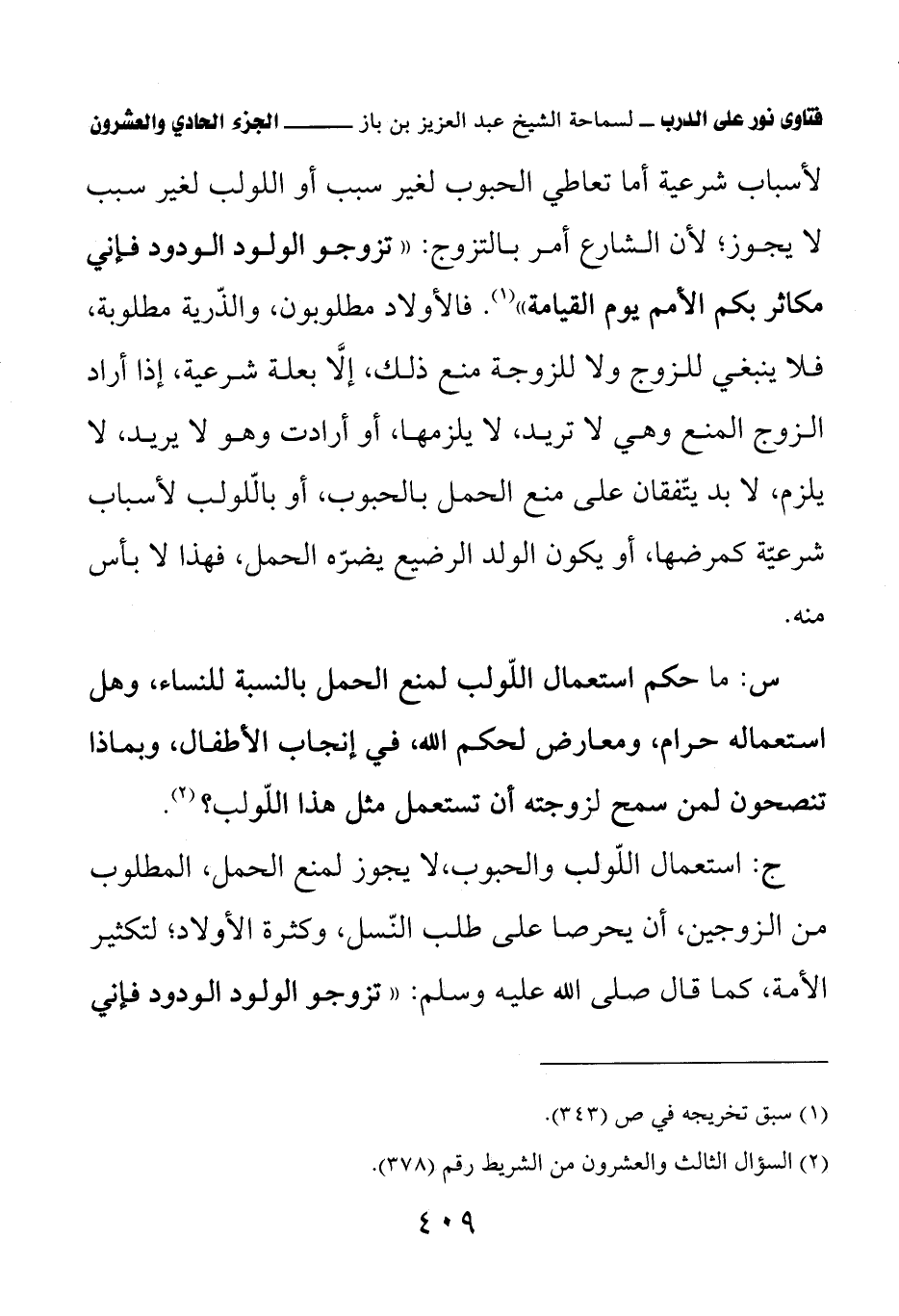 لأسباب شرعية أما تعاطي الحبوب لغير سبب أو اللولب لغير سبب لا يجوز؛ لأن الشارع أمر بالتزوج: «تزوجوا الولود الودود، فإني مكاثر بكم الأمم يوم القيامة» (¬1) فالأولاد مطلوبون، والذرية مطلوبة، فلا ينبغي للزوج ولا للزوجة منع ذلك، إلا بعلة شرعية، إذا أراد الزوج المنع وهي لا تريد، لا يلزمها، أو أرادت وهو لا يريد، لا يلزم، لا بد يتفقان على منع الحمل بالحبوب، أو باللولب لأسباب شرعية كمرضها، أو يكون الولد الرضيع يضره الحمل، فهذا لا بأس منه.