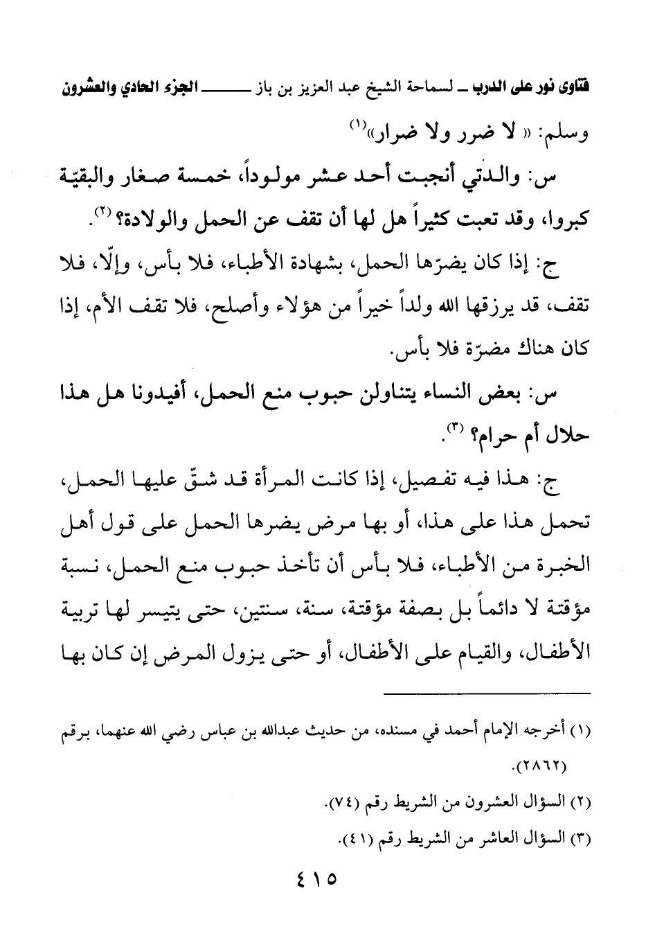 ج: هذا فيه تفصيل، إذا كانت المرأة قد شق عليها الحمل، تحمل هذا على هذا، أو بها مرض يضرها الحمل على قول أهل الخبرة من الأطباء، فلا بأس أن تأخذ حبوب منع الحمل، نسبة مؤقتة لا دائما بل بصفة مؤقتة، سنة، سنتين، حتى يتيسر لها تربية الأطفال، والقيام على الأطفال، أو حتى يزول المرض إن كان بها