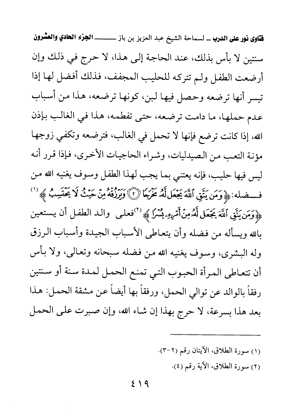 سنتين لا بأس بذلك، عند الحاجة إلى هذا، لا حرج في ذلك وإن أرضعت الطفل ولم تتركه للحليب المجفف، فذلك أفضل لها إذا تيسر أنها ترضعه وحصل فيها لبن، كونها ترضعه، هذا من أسباب عدم حملها، ما دامت ترضعه، حتى تفطمه، هذا في الغالب بإذن الله، إذا كانت ترضع فإنها لا تحمل في الغالب، فترضعه وتكفي زوجها مؤنة التعب من الصيدليات، وشراء الحاجيات الأخرى، فإذا قرر أنه ليس فيها حليب، فإنه يعتني بما يجب لهذا الطفل وسوف يغنيه الله من فضله: {وَمَنْ يَتَّقِ اللَّهَ يَجْعَلْ لَهُ مَخْرَجًا (2) وَيَرْزُقْهُ مِنْ حَيْثُ لا يَحْتَسِبُ} {وَمَنْ يَتَّقِ اللَّهَ يَجْعَلْ لَهُ مِنْ أَمْرِهِ يُسْرًا} فعلى والد الطفل أن يستعين بالله ويسأله من فضله وأن يتعاطى الأسباب الجيدة وأسباب الرزق وله البشرى، وسوف يغنيه الله من فضله سبحانه وتعالى، ولا بأس أن تتعاطى المرأة الحبوب التي تمنع الحمل لمدة سنة أو سنتين رفقا بالوالد عن توالي الحمل، ورفقا بها أيضا عن مشقة الحمل: هذا بعد هذا بسرعة، لا حرج بهذا إن شاء الله، وإن صبرت على الحمل