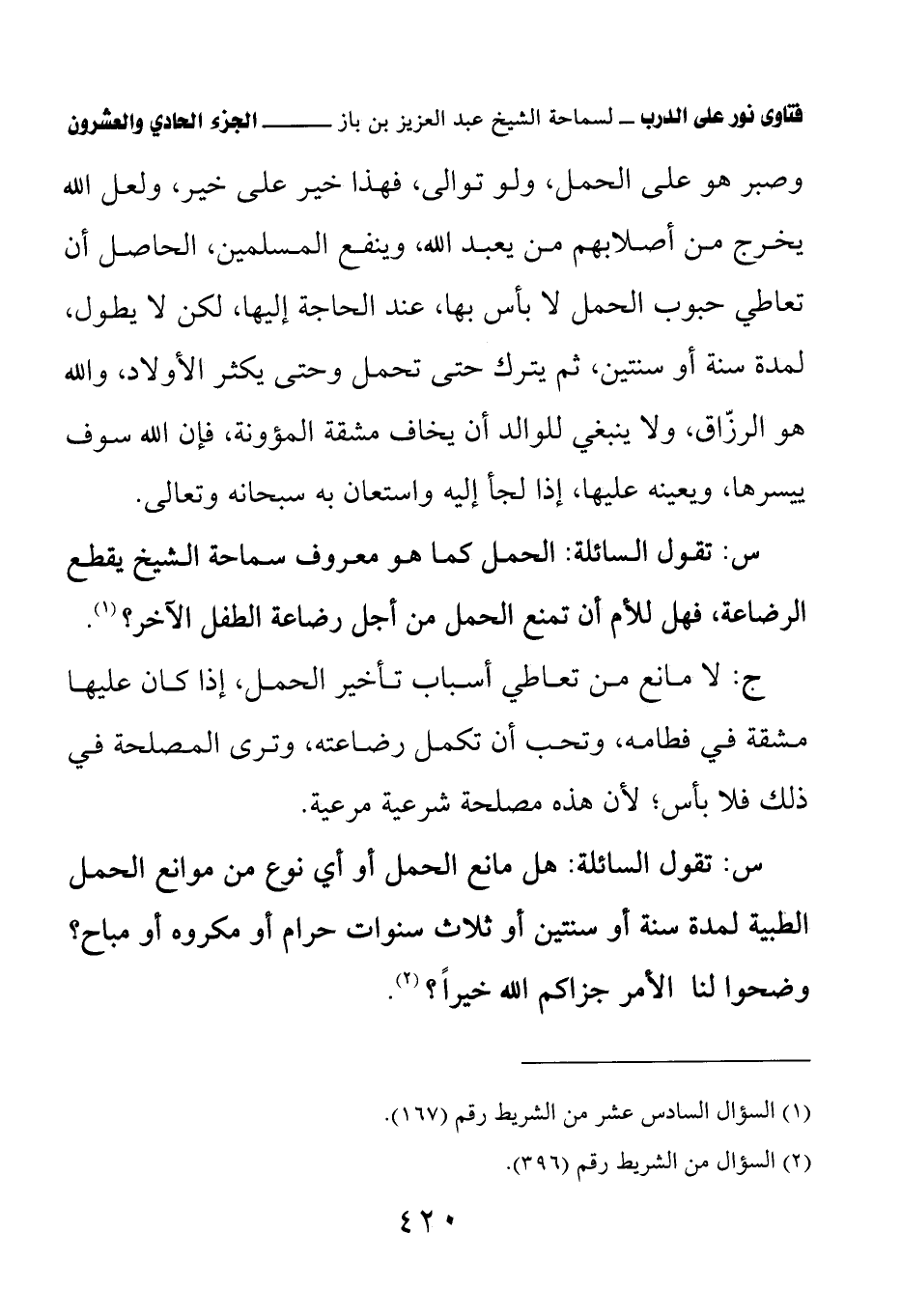س: تقول السائلة: الحمل كما هو معروف سماحة الشيخ يقطع الرضاعة، فهل للأم أن تمنع الحمل من أجل رضاعة الطفل الآخر؟ (¬1)