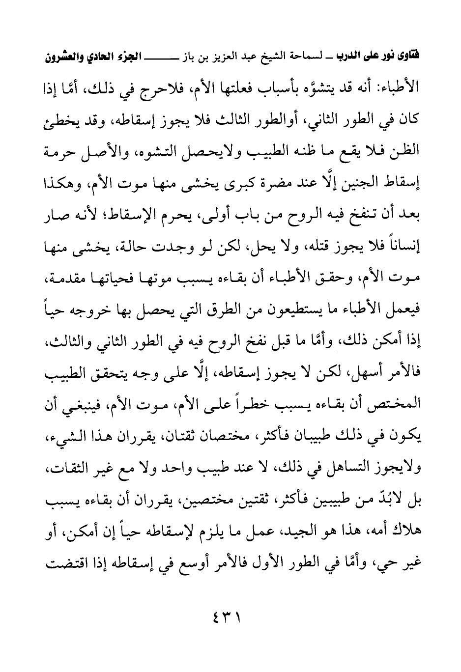 الأطباء: أنه قد يتشوه بأسباب فعلتها الأم، فلا حرج في ذلك، أما إذا كان في الطور الثاني، أو الطور الثالث فلا يجوز إسقاطه، وقد يخطئ الظن فلا يقع ما ظنه الطبيب ولا يحصل التشوه، والأصل حرمة إسقاط الجنين إلا عند مضرة كبرى يخشى منها موت الأم، وهكذا بعد أن تنفخ فيه الروح من باب أولى، يحرم الإسقاط؛ لأنه صار إنسانا فلا يجوز قتله، ولا يحل، لكن لو وجدت حالة، يخشى منها موت الأم، وحقق الأطباء أن بقاءه يسبب موتها فحياتها مقدمة، فيعمل الأطباء ما يستطيعون من الطرق التي يحصل بها خروجه حيا إذا أمكن ذلك، وأما ما قبل نفخ الروح فيه في الطور الثاني والثالث، فالأمر أسهل، لكن لا يجوز إسقاطه، إلا على وجه يتحقق الطبيب المختص أن بقاءه يسبب خطرا على الأم، موت الأم، فينبغي أن يكون في ذلك طبيبان فأكثر، مختصان ثقتان، يقرران هذا الشيء، ولا يجوز التساهل في ذلك، لا عند طبيب واحد ولا مع غير الثقات، بل لا بد من طبيبين فأكثر، ثقتين مختصين، يقرران أن بقاءه يسبب هلاك أمه، هذا هو الجيد، عمل ما يلزم لإسقاطه حيا إن أمكن، أو غير حي، وأما في الطور الأول فالأمر أوسع في إسقاطه إذا اقتضت