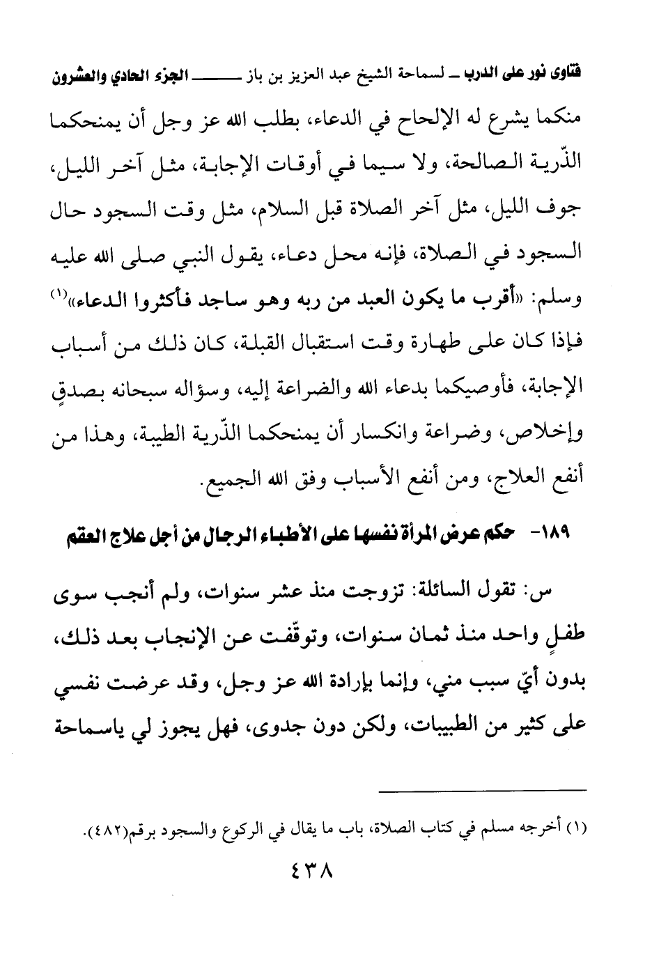 منكما يشرع له الإلحاح في الدعاء، بطلب الله عز وجل أن يمنحكما الذرية الصالحة، ولا سيما في أوقات الإجابة، مثل آخر الليل، جوف الليل، مثل آخر الصلاة قبل السلام، مثل وقت السجود حال السجود في الصلاة، فإنه محل دعاء، يقول النبي صلى الله عليه وسلم: «أقرب ما يكون العبد من ربه وهو ساجد فأكثروا الدعاء» (¬1) فإذا كان على طهارة وقت استقبال القبلة، كان ذلك من أسباب الإجابة، فأوصيكما بدعاء الله والضراعة إليه، وسؤاله سبحانه بصدق وإخلاص، وضراعة وانكسار أن يمنحكما الذرية الطيبة، وهذا من أنفع العلاج، ومن أنفع الأسباب وفق الله الجميع.