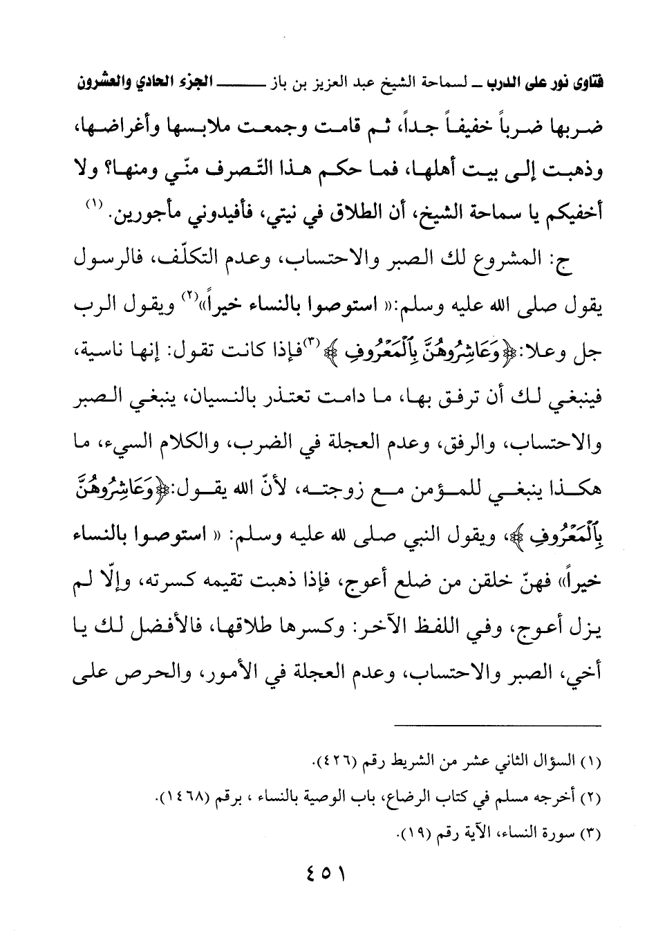 ج: المشروع لك الصبر والاحتساب، وعدم التكلف، فالرسول يقول صلى الله عليه وسلم: «استوصوا بالنساء خيرا» (¬2) ويقول الرب جل وعلا: {وَعَاشِرُوهُنَّ بِالْمَعْرُوفِ} فإذا كانت تقول: إنها ناسية، فينبغي لك أن ترفق بها، ما دامت تعتذر بالنسيان، ينبغي الصبر والاحتساب، والرفق، وعدم العجلة في الضرب، والكلام السيئ، ما هكذا ينبغي للمؤمن مع زوجته، لأن الله يقول: {وَعَاشِرُوهُنَّ بِالْمَعْرُوفِ}، ويقول النبي صلى الله عليه وسلم: «استوصوا بالنساء خيرا فهن خلقن من ضلع أعوج، فإذا ذهبت تقيمه كسرته، وإلا لم يزل أعوج» (¬3)، وفي اللفظ الآخر: «وكسرها طلاقها» (¬4)، فالأفضل لك يا أخي، الصبر والاحتساب، وعدم العجلة في الأمور، والحرص على