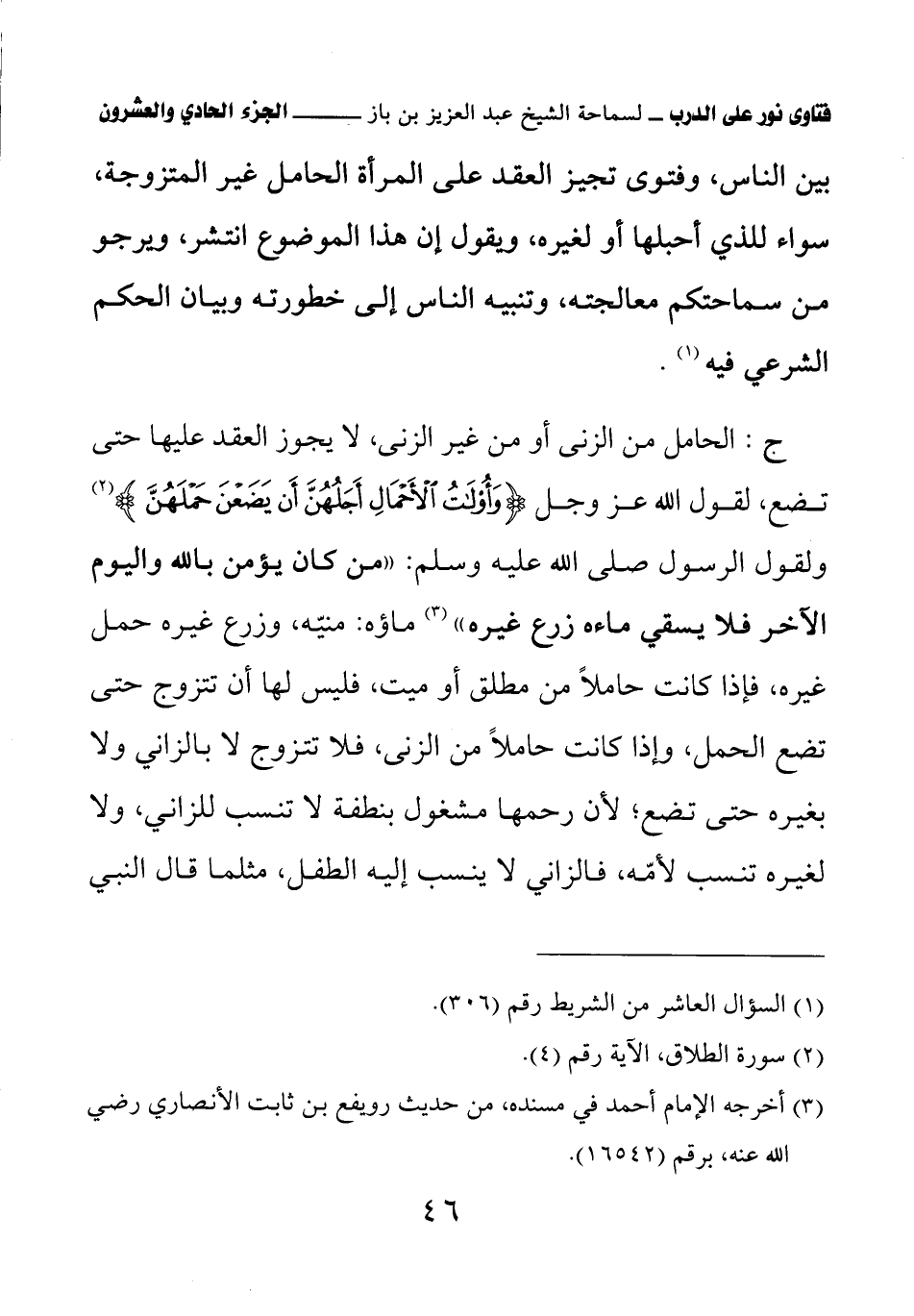 ج: الحامل من الزنى أو من غير الزنى، لا يجوز العقد عليها حتى تضع، لقول الله عز وجل: {وَأُولاتُ الأَحْمَالِ أَجَلُهُنَّ أَنْ يَضَعْنَ حَمْلَهُنَّ} ولقول الرسول صلى الله عليه وسلم: «من كان يؤمن بالله واليوم الآخر فلا يسقي ماءه زرع غيره» (¬2) ماؤه: منيه، وزرع غيره حمل غيره، فإذا كانت حاملا من مطلق أو ميت، فليس لها أن تتزوج حتى تضع الحمل، وإذا كانت حاملا من الزنى، فلا تتزوج لا بالزاني ولا بغيره حتى تضع؛ لأن رحمها مشغول بنطفة لا تنسب للزاني، ولا لغيره تنسب لأمه، فالزاني لا ينسب إليه الطفل، مثلما قال النبي