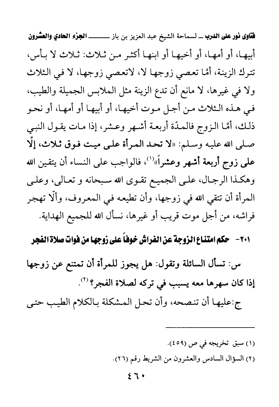 أبيها، أو أمها، أو أخيها أو ابنها أكثر من ثلاث: ثلاث لا بأس، تترك الزينة، أما تعصي زوجها لا، لا تعصي زوجها، لا في الثلاث ولا في غيرها، لا مانع أن تدع الزينة مثل الملابس الجميلة والطيب، في هذه الثلاث من أجل موت أخيها، أو أبيها أو أمها، أو نحو ذلك، أما الزوج فالمدة أربعة أشهر وعشر، إذا مات يقول النبي صلى اله عليه وسلم: «لا تحد المرأة على ميت فوق ثلاث، إلا على زوج أربعة أشهر وعشرا» (¬1) فالواجب على النساء أن يتقين الله وهكذا الرجال، على الجميع تقوى الله سبحانه وتعالى، وعلى المرأة أن تتقي الله في زوجها، وأن تطيعه في المعروف، وألا تهجر فراشه، من أجل موت قريب أو غيرها، نسأل الله للجميع الهداية.