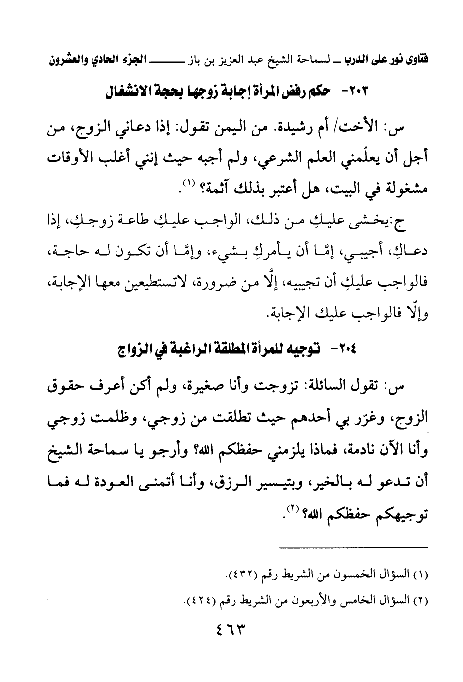 203 - حكم رفض المرأة إجابة زوجها بحجة الانشغال