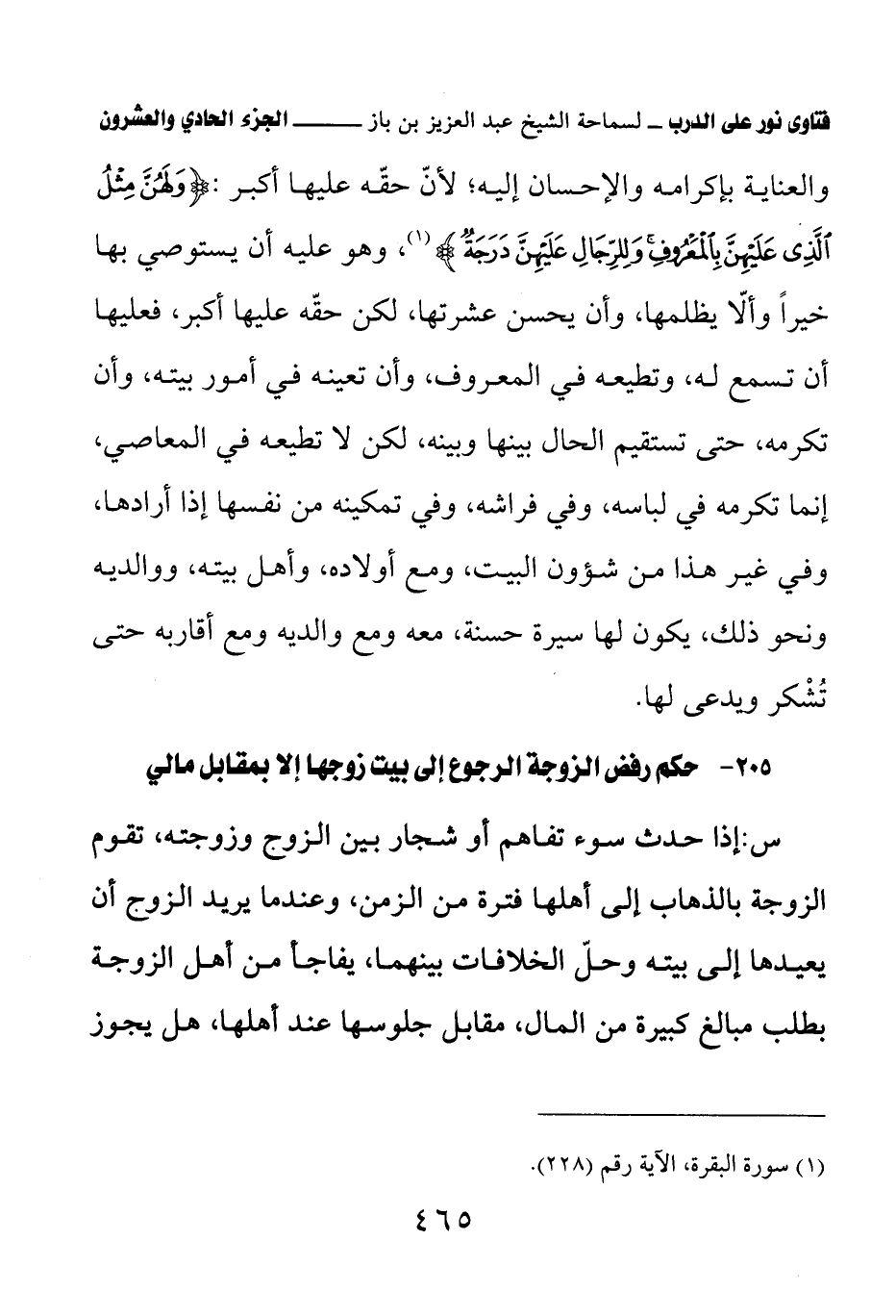 205 - حكم رفض الزوجة الرجوع إلى بيت زوجها إلا بمقابل مالي