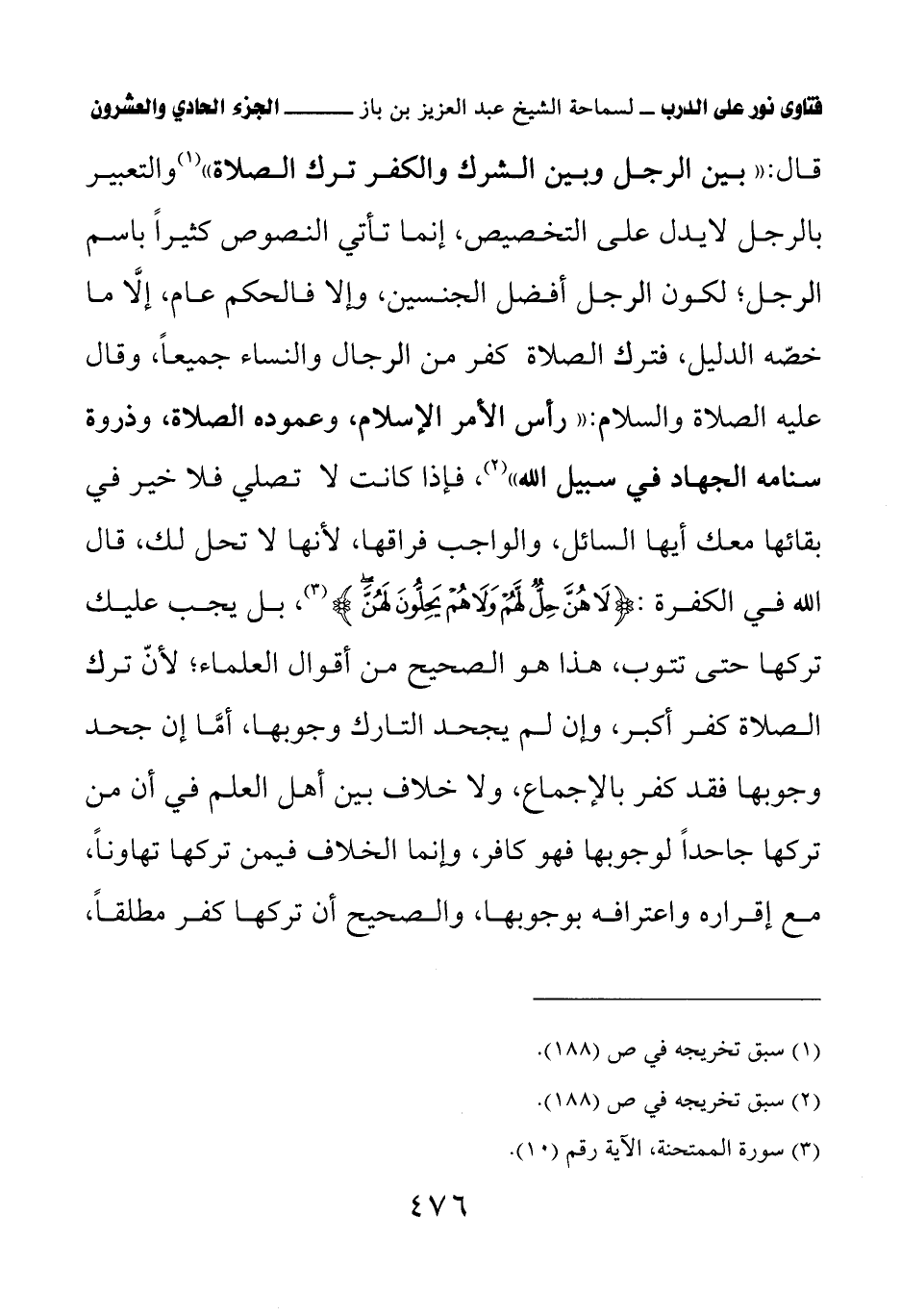 قال: «بين الرجل وبين الشرك- والكفر ترك الصلاة» (¬1) والتعبير بالرجل لا يدل على التخصيص، إنما تأتي النصوص كثيرا باسم الرجل؛ لكون الرجل أفضل الجنسين، وإلا فالحكم عام، إلا ما خصه الدليل، فترك الصلاة كفر من الرجال والنساء جميعا، وقال عليه الصلاة والسلام: «رأس الأمر الإسلام، وعموده الصلاة، وذروة سنامه الجهاد في سبيل الله» (¬2) فإذا كانت لا تصلي فلا خير في بقائها معك أيها السائل، والواجب فراقها، لأنها لا تحل لك، قال الله في الكفرة: {لا هُنَّ حِلٌّ لَهُمْ وَلا هُمْ يَحِلُّونَ لَهُنَّ}، بل يجب عليك تركها حتى تتوب، هذا هو الصحيح من أقوال العلماء؛ لأن ترك الصلاة كفر أكبر، وإن لم يجحد التارك وجوبها، أما إن جحد وجوبها فقد كفر بالإجماع، ولا خلاف بين أهل العلم في أن من تركها جاحدا لوجوبها فهو كافر، وإنما الخلاف فيمن تركها تهاونا، مع إقراره واعترافه بوجوبها، والصحيح أن تركها كفر مطلقا،