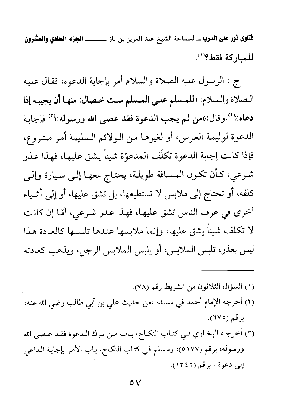 ج- الرسول عليه الصلاة والسلام أمر بإجابة الدعوة، فقال عليه الصلاة والسلام: «للمسلم على المسلم ست خصال: منها أن يجيبه إذا دعاه» (¬2) وقال: «من لم يجب الدعوة فقد عصى الله ورسوله» (¬3) فإجابة الدعوة لوليمة العرس، أو لغيرها من الولائم السليمة أمر مشروع، فإذا كانت إجابة الدعوة تكلف المدعوة شيئا يشق عليها، فهذا عذر شرعي، كأن تكون المسافة طويلة، يحتاج معها إلى سيارة وإلى كلفة، أو تحتاج إلى ملابس لا تستطيعها، بل تشق عليها، أو إلى أشياء أخرى في عرف الناس تشق عليها، فهذا عذر شرعي، أما إن كانت لا تكلف شيئا يشق عليها، وإنما ملابسها عندها تلبسها كالعادة هذا ليس بعذر، تلبس الملابس، أو يلبس الملابس الرجل، ويذهب كعادته