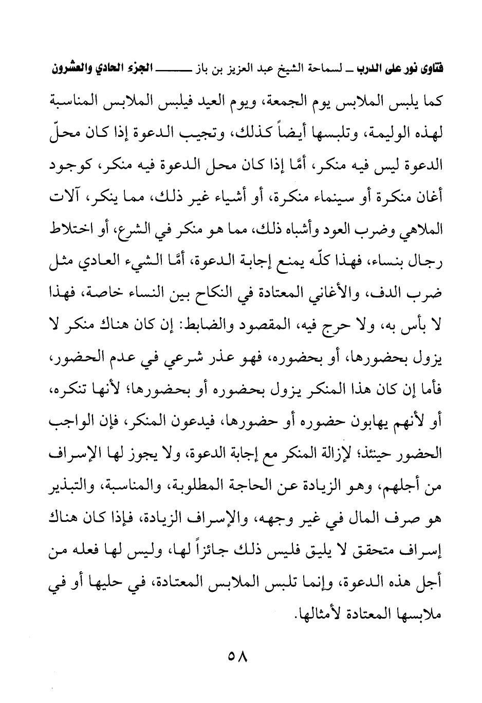 كما يلبس الملابس يوم الجمعة، ويوم العيد فيلبس الملابس المناسبة لهذه الوليمة، وتلبسها أيضا كذلك، وتجيب الدعوة إذا كان محل الدعوة ليس فيه منكر، أما إذا كان محل الدعوة فيه منكر، كوجود أغان منكرة أو سينماء منكرة، أو أشياء غير ذلك، مما ينكر، آلات الملاهي وضرب العود وأشباه ذلك، مما هو منكر في الشرع، أو اختلاط رجال بنسء، فهذا كله يمنع إجابة الدعوة.
