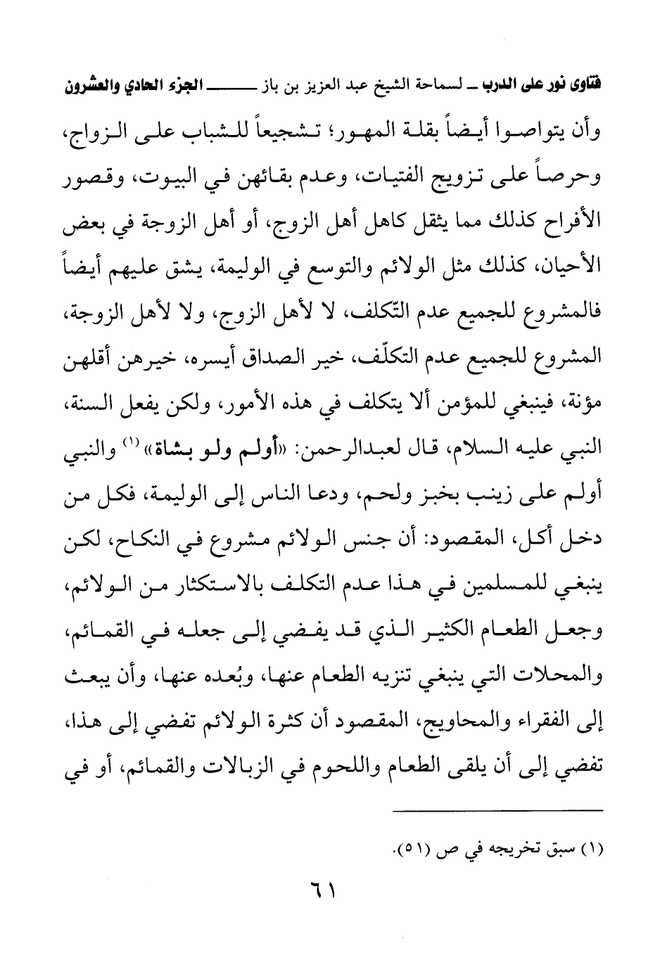 وأن يتواصوا أيضا بقلة المهور؛ تشجيعا للشباب على الزواج، وحرصا على تزويج الفتيات، وعدم بقائهن في البيوت، وقصور الأفراح كذلك مما يثقل كاهل أهل الزوج، أو أهل الزوجة في بعض الأحيان، كذلك مثل الولائم والتوسع في الوليمة، يشق عليهم أيضا فالمشروع للجميع عدم التكلف، لا لأهل الزوج، ولا لأهل الزوجة، المشروع للجميع عدم التكلف، خير الصداق أيسره، خيرهن أقلهن مؤنة، فينبغي للمؤمن ألا يتكلف في هذه الأمور، ولكن يفعل السنة، النبي عليه السلام، قال لعبد الرحمن: «أولم ولو بشاة» (¬1) والنبي أولم على زينب بخبز ولحم، ودعا الناس إلى الوليمة، فكل من دخل أكل، المقصود: أن جنس الولائم مشروع في النكاح، لكن ينبغي للمسلمين في هذا عدم التكلف بالاستكثار من الولائم، وجعل الطعام الكثير الذي قد يفضي إلى جعله في القمائم، والمحلات التي ينبغي تنزيه الطعام عنها، وبعده عنها، وأن يبعث إلى الفقراء والمحاويج، المقصود أن كثرة الولائم تفضي إلى هذا، تفضي إلى أن يلقى الطعام واللحوم في الزبالات والقمائم، أو في
