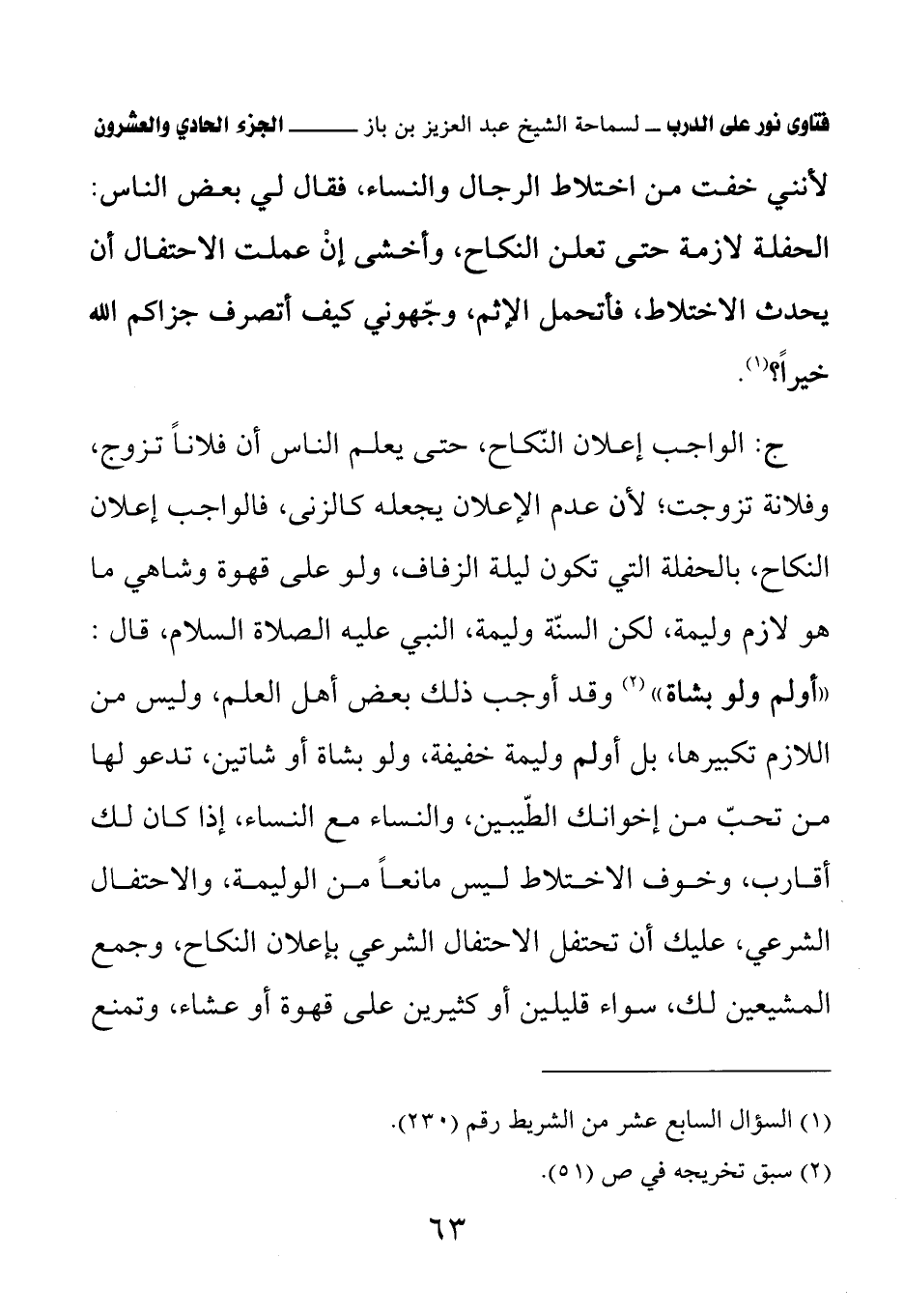ج: الواجب إعلان النكاح، حتى يعلم الناس أن فلانا تزوج، وفلانة تزوجت، لأن عدم الإعلان يجعله كالزنى، فالواجب إعلان النكاح، بالحفلة التي تكون ليلة الزفاف، ولو على قهوة وشاهي ما هو لازم وليمة، لكن السنة وليمة، النبي عليه الصلاة والسلام، قال: «أولم ولو بشاة» (¬2) وقد أوجب ذلك بعض أهل العلم، وليس من اللازم تكبيرها، بل أولم وليمة خفيفة، ولو بشاة أو شاتين، تدعو لها من تحب من إخوانك الطيبين، والنساء مع النساء، إذا كان لك أقارب، وخوف الاختلاط ليس مانعا من الوليمة، والاحتفال الشرعي، عليك أن تحتفل الاحتفال الشرعي بإعلان النكاح، وجمع المشيعين لك، سواء قليلين أو كثيرين على قهوة أو عشاء، وتمنع