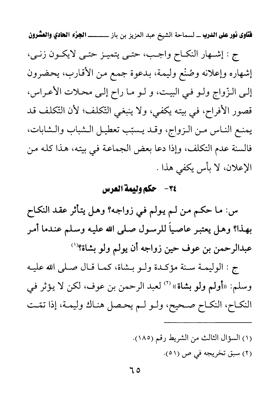 ج: إشهار النكاح واجب، حتى يتميز حتى لا يكون زنى، إشهاره وإعلانه وصنع وليمة، بدعوة جمع من الأقارب، يحضرون إلى الزواج ولو في البيت، ولو ما راح إلى محلات الأعراس، قصور الأفراح، في بيته يكفي، ولا ينبغي التكلف؛ لأن التكلف قد يمنع الناس من الزواج، وقد يسبب تعطيل الشباب والشابات، فالسنة عدم التكلف، وإذا دعا بعض الجماعة في بيته، هذا كله من الإعلان، لا بأس يكفي هذا.