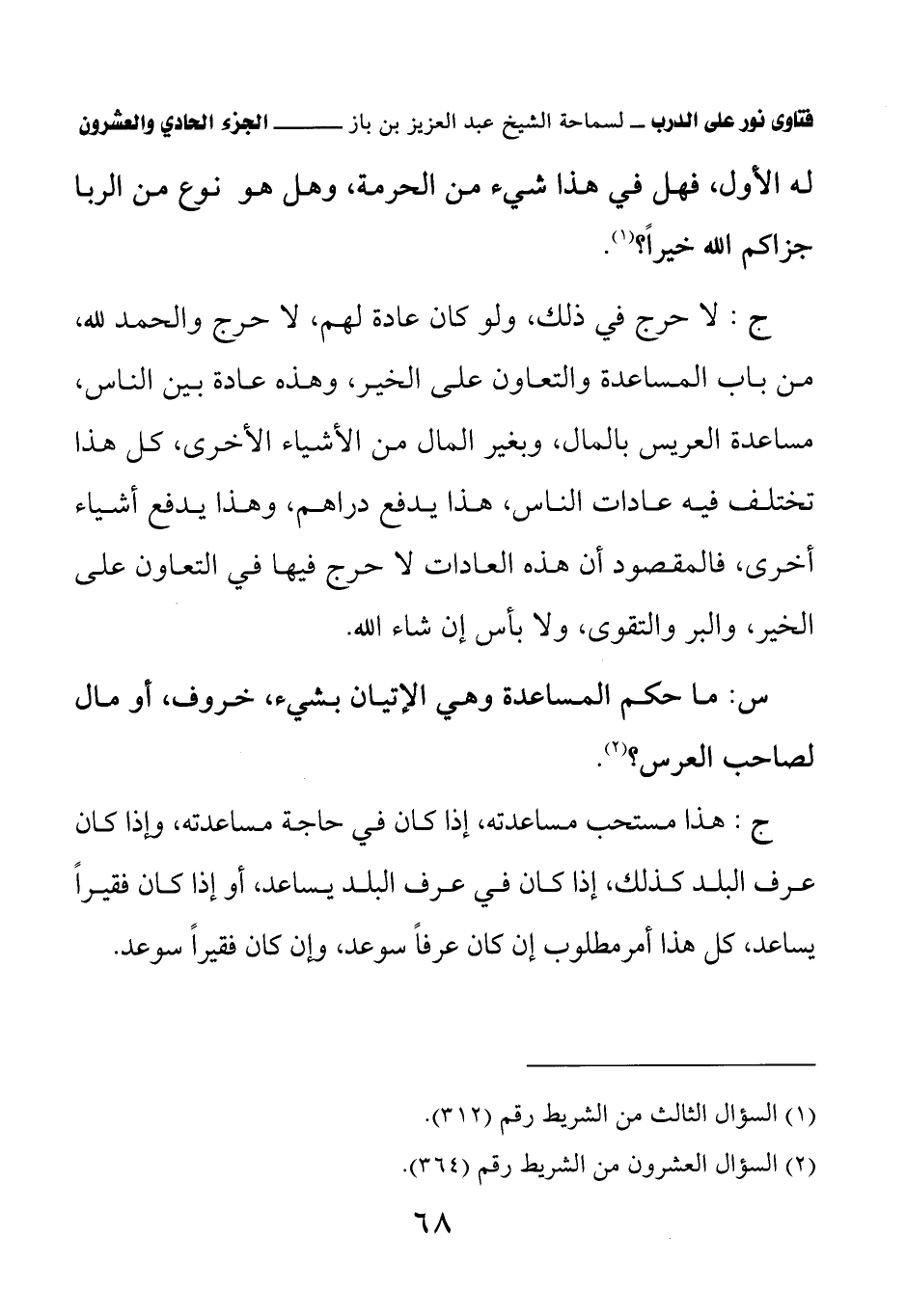ج: لا حرج في ذلك، ولو كان عادة لهم، لا حرج والحمد لله، من باب المساعدة والتعاون على الخير، وهذه عادة بين الناس، مساعدة العريس بالمال، وبغير المال من الأشياء الأخرى، كل هذا تختلف فيه عادات الناس، هذا يدفع دراهم، وهذا يدفع أشياء أخرى، فالمقصود أن هذه العادات لا حرج فيها في التعاون على الخير، والبر والتقوى، ولا بأس إن شاء الله.