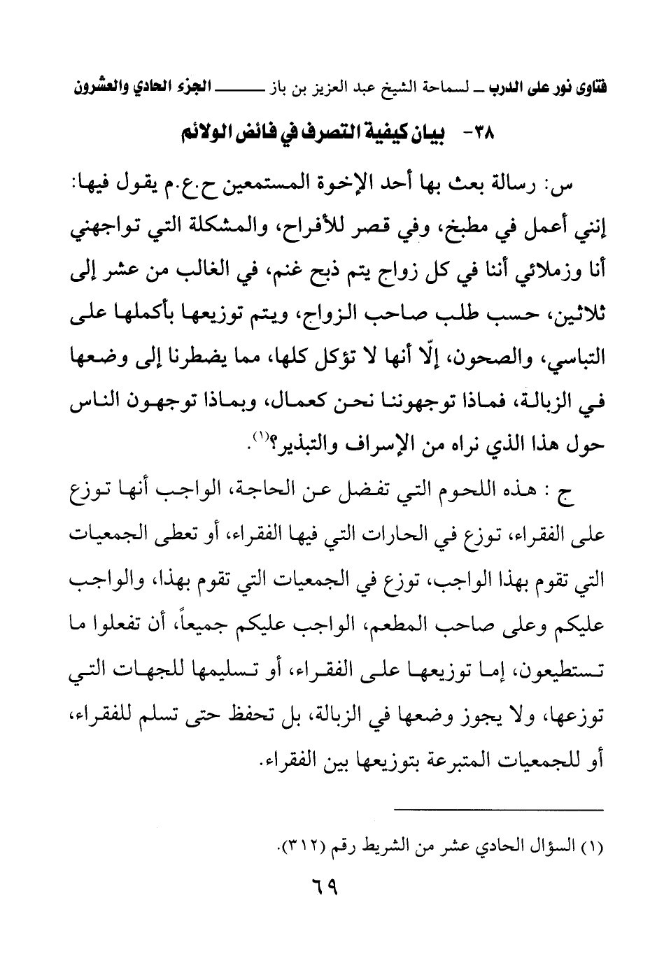 ج: هذه اللحوم التي تفضل عن الحاجة، الواجب أنها توزع على الفقراء، توزع في الحارات التي فيها الفقراء، أو تعطى الجمعيات التي تقوم بهذا الواجب، توزع في الجمعيات التي تقوم بهذا، والواجب عليكم وعلى صاحب المطعم، الواجب عليكم جميعا، أن تفعلوا ما تستطيعون، إما توزيعها على الفقراء، أو تسليمها للجهات التي توزعها، ولا يجوز وضعها في الزبالة، بل تحفظ حتى تسلم للفقراء، أو للجمعيات المتبرعة بتوزيعها بين الفقراء.