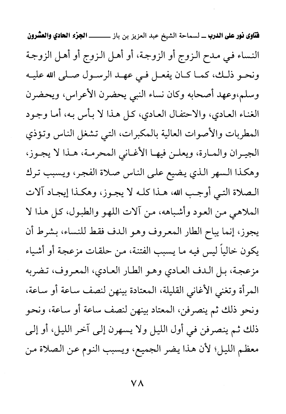 النساء في مدح الزوج أو الزوجة، أو أهل الزوج أو أهل الزوجة ونحو ذلك، كما كان يفعل في عهد الرسول صلى الله عليه وسلم، وعهد أصحابه وكان نساء النبي يحضرن الأعراس، ويحضرن الغناء العادي، والاحتفال العادي، كل هذا لا بأس به، أما وجود المطربات والأصوات العالية بالمكبرات، التي تشغل الناس وتؤذي الجيران والمارة، ويعلن فيها الأغاني المحرمة، هذا لا يجوز، وهكذا السهر الذي يضيع على الناس صلاة الفجر، ويسبب ترك الصلاة التي أوجب الله، هذا كله لا يجوز، وهكذا إيجاد آلات الملاهي من العود وأشباهه، من آلات اللهو والطبول، كل هذا لا يجوز، إنما يباح الطار المعروف وهو الدف فقط للنساء، بشرط أن يكون خاليا ليس فيه ما يسبب الفتنة، من حلقات مزعجة أو أشياء مزعجة، بل الدف العادي وهو الطار العادي، المعروف، تضربه المرأة وتغني الأغاني القليلة، المعتادة بينهن لنصف ساعة أو ساعة، ونحو ذلك ثم ينصرفن، المعتاد بينهن لنصف ساعة أو ساعة، ونحو ذلك ثم ينصرفن في أول الليل ولا يسهرن إلى آخر الليل، أو إلى معظم الليل؛ لأن هذا يضر الجميع، ويسبب النوم عن الصلاة من