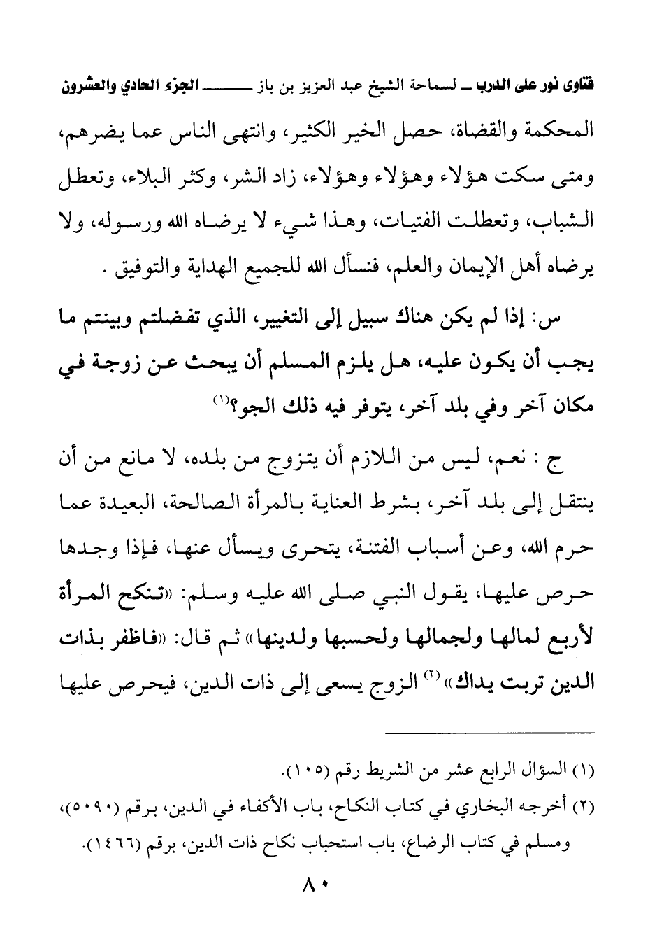 ج: نعم، ليس من اللازم أن يتزوج من بلده، لا مانع من أن ينتقل إلى بلد آخر، بشرط العناية بالمرأة الصالحة، البعيدة عما حرم الله، وعن أسباب الفتنة، يتحرى ويسأل عنها، فإذا وجدها حرص عليها، يقول النبي صلى الله عليه وسلم: «تنكح المرأة لأربع لمالها ولجمالها ولحسبها ولدينها ثم قال: فاظفر بذات الدين تربت يداك» (¬2) الزوج يسعى إلى ذات الدين، فيحرص عليها