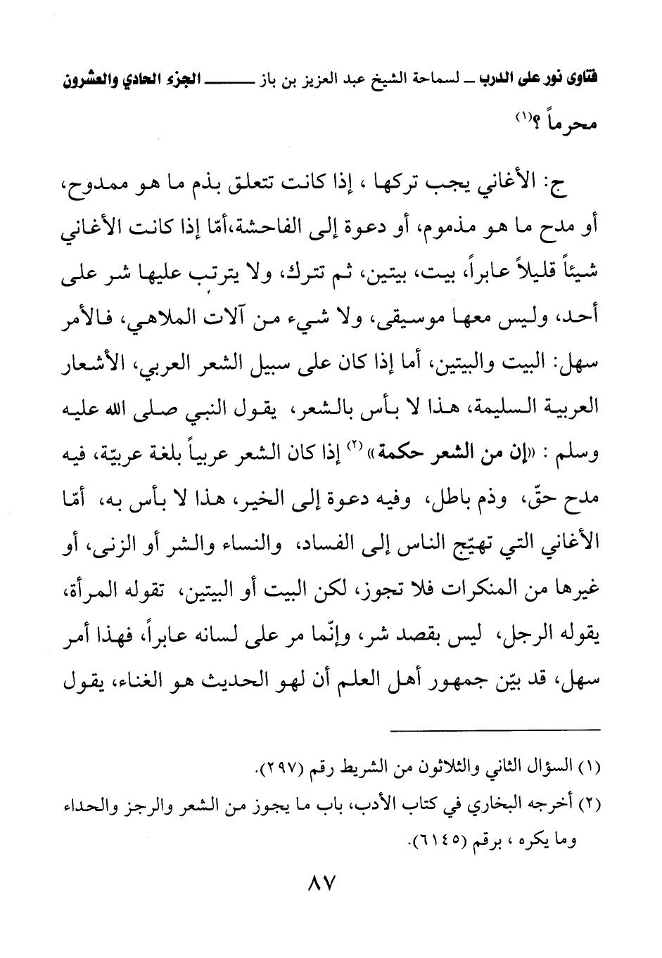 ج: الأغاني يجب تركها، إذا كانت تتعلق بذم ما هو ممدوح، أو مدح ما هو مذموم، أو دعوة إلى الفاحشة، أما إذا كانت الأغاني شيئا قليلا عابرا، بيت، بيتين، ثم تترك، ولا يترتب عليها شر على أحد، وليس معها موسيقى، ولا شيء من آلات الملاهي، فالأمر سهل: البيت والبيتين، أما إذا كان على سبيل الشعر العربي، الأشعار العربية السليمة، هذا لا بأس بالشعر، يقول النبي صلى الله عليه وسلم: «إن من الشعر حكمة» (¬2) إذا كان الشعر عربيا بلغة عربية، فيه مدح حق، وذم باطل، وفيه دعوة إلى الخير، هذا لا بأس به، أما الأغاني التي تهيج الناس إلى الفساد، والنساء والشر أو الزنى، أو غيرها من المنكرات فلا تجوز، لكن البيت أو البيتين، تقوله المرأة، يقوله الرجل، ليس بقصد شر، وإنما مر على لسانه عابرا، فهذا أمر سهل، قد بين جمهور أهل العلم أن لهو الحديث هو الغناء، يقول