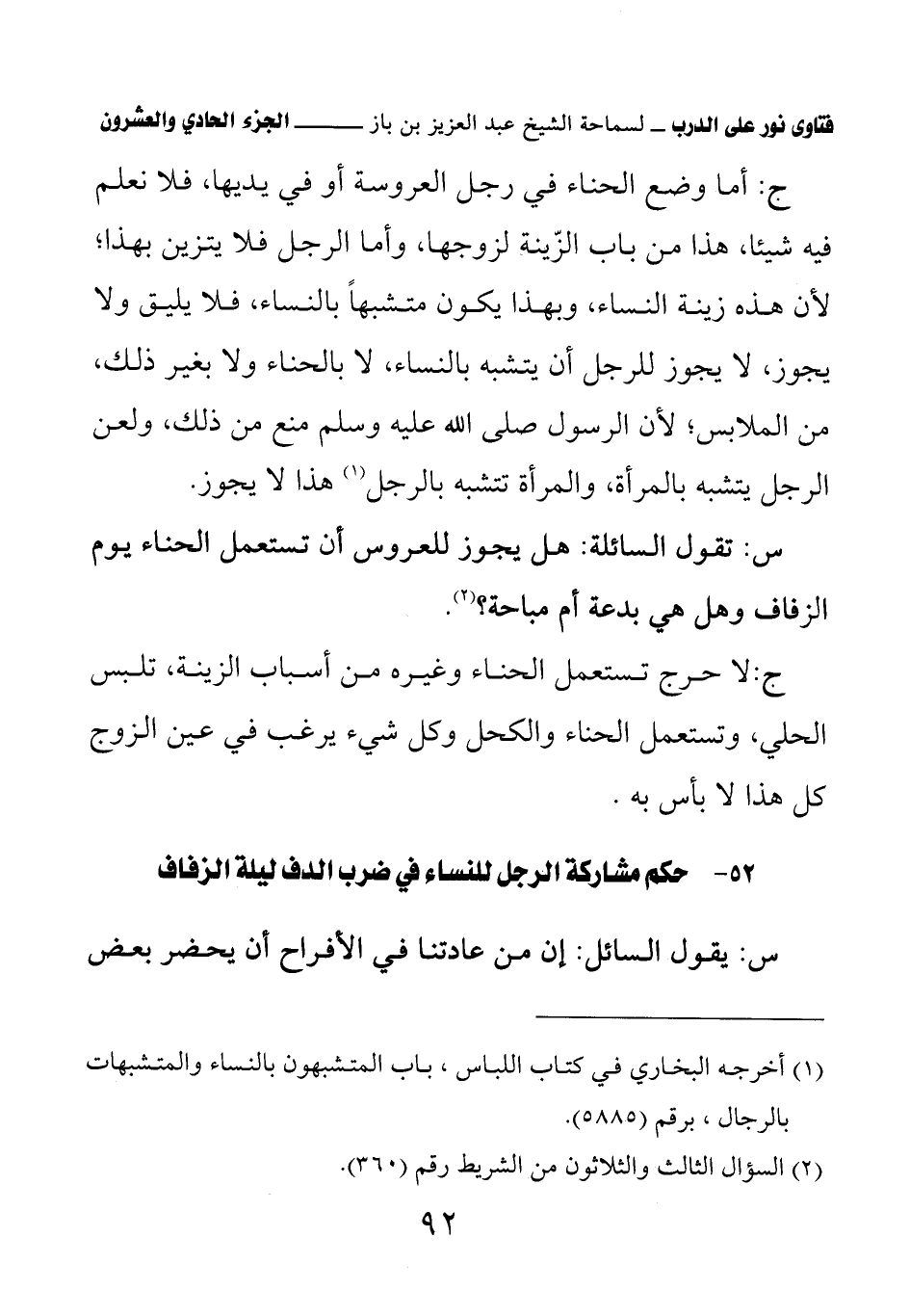 ج: أما وضع الحناء في رجل العروسة أو في يديها، فلا نعلم فيه شيئا، هذا من باب الزينة لزوجها، وأما الرجل فلا يتزين بهذا؛ لأن هذه زينة النساء، وبهذا يكون متشبها بالنساء، فلا يليق ولا يجوز، لا يجوز للرجل أن يتشبه بالنساء، لا بالحناء ولا بغير ذلك، من الملابس؛ لأن الرسول صلى الله عليه وسلم منع من ذلك، «ولعن الرجل يتشبه بالمرأة، والمرأة تتشبه بالرجل» (¬1) هذا لا يجوز.