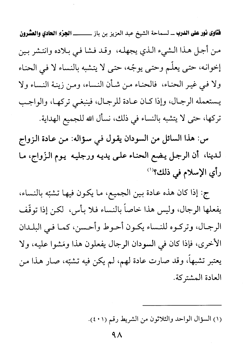 ج: إذا كان هذه عادة بين الجميع، ما يكون فيها تشبه بالنساء، يفعلها الرجال، وليس هذا خاصا بالنساء فلا بأس، لكن إذا توقف الرجال، وتركوه للنساء يكون أحوط وأحسن، كما في البلدان الأخرى، فإذا كان في السودان الرجال يفعلون هذا ومشوا عليه، ولا يعتبر تشبها، وقد صارت عادة لهم، لم يكن فيه تشبه، صار هذا من العادة المشتركة.