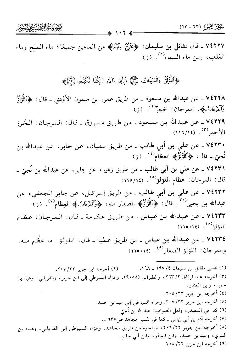 ٧٤٢٢٨ - عن عبد الله بن مسعود -من طريق عمرو بن ميمون الأَوْدي- قال: {اللُّؤْلُؤُ والمَرْجانُ}، المرجان: حَجرٌ (¬٢). (ز)