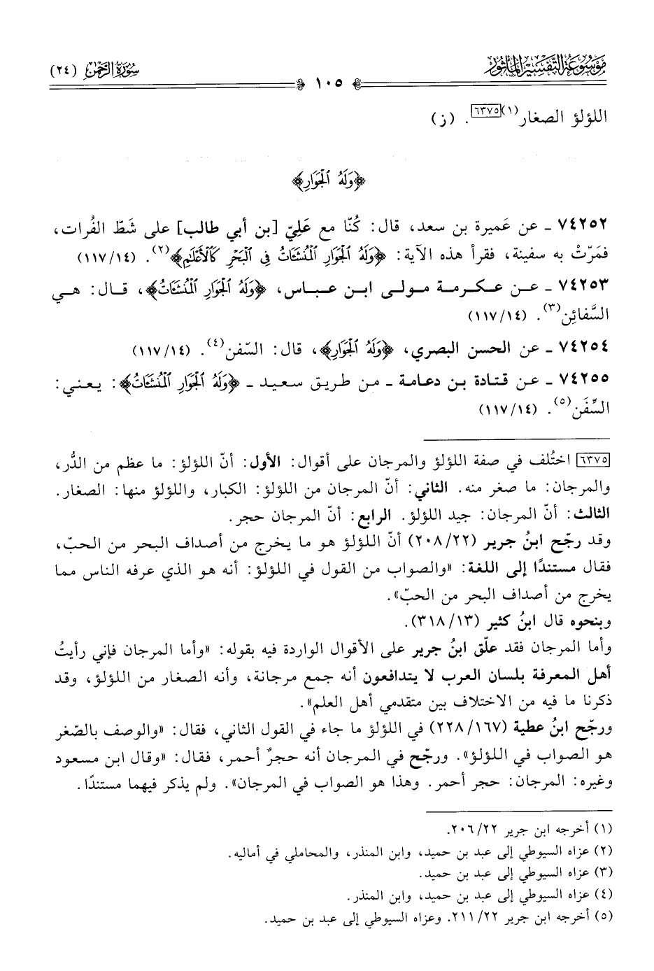 ٧٤٢٥٣ - عن عكرمة مولى ابن عباس، {ولَهُ الجَوارِ المُنْشَآتُ}، قال: هي السَّفائِن (¬٣). (١٤/ ١١٧)