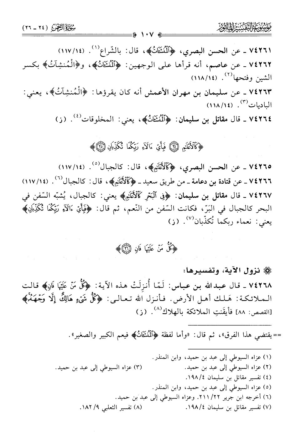 ٧٤٢٦٣ - عن سليمان بن مهران الأعمش أنه كان يقرؤها: «المُنشِآتُ»، يعني: الباديات (¬٣). (١٤/ ١١٨)