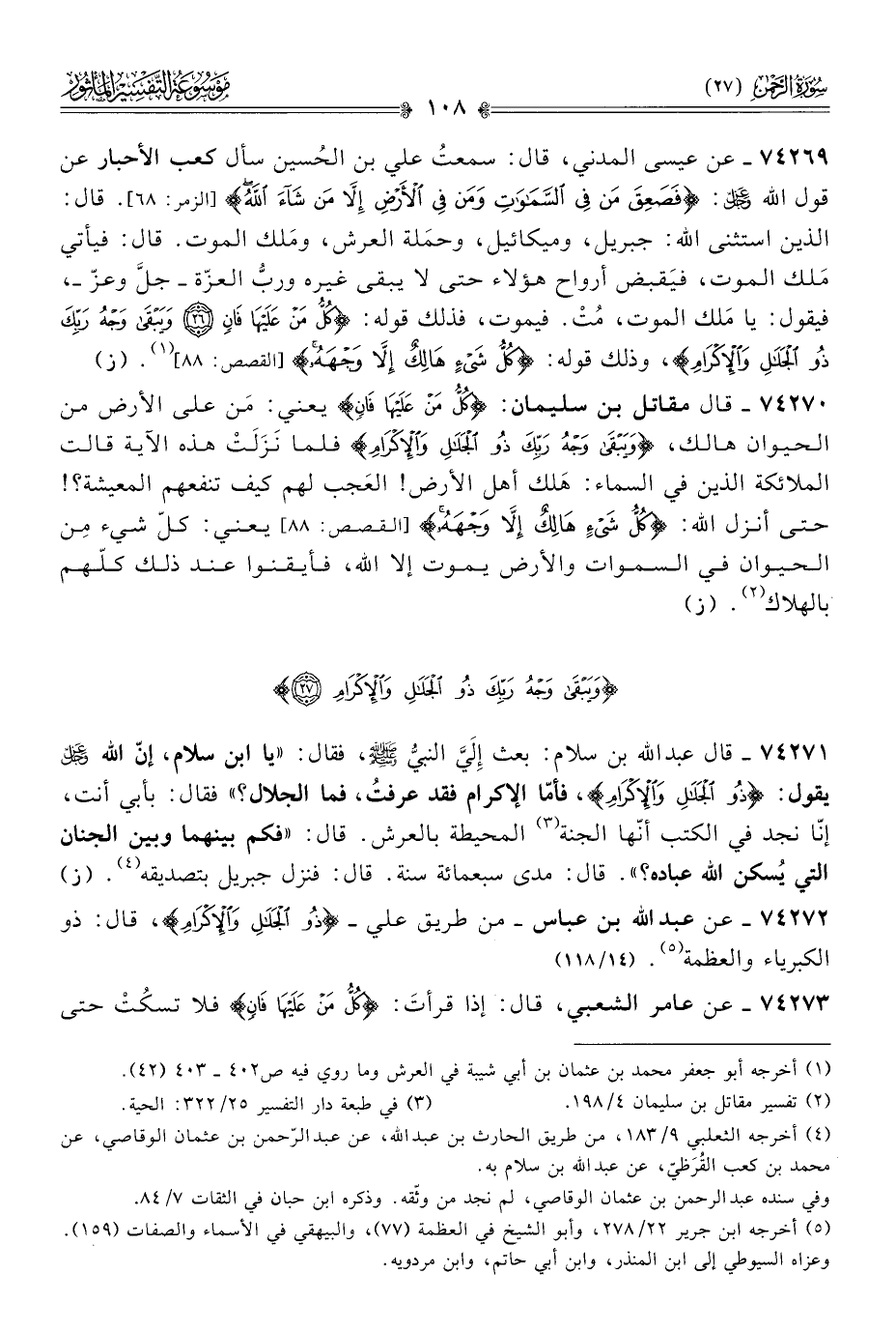 ٧٤٢٧٢ - عن عبد الله بن عباس -من طريق علي- {ذُو الجَلالِ والإكْرام}، قال: ذو الكبرياء والعظمة (¬٥). (١٤/ ١١٨)