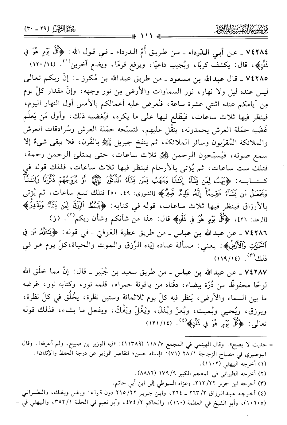 ٧٤٢٨٤ - عن أبي الدّرداء -من طريق أُمّ الدرداء- في قول الله: {كُلَّ يَوْمٍ هُوَ فِي شَأْنٍ}، قال: يكشف كربًا، ويُجيب داعيًا، ويرفع قومًا، ويضع آخرين (¬١). (١٤/ ١٢٠)