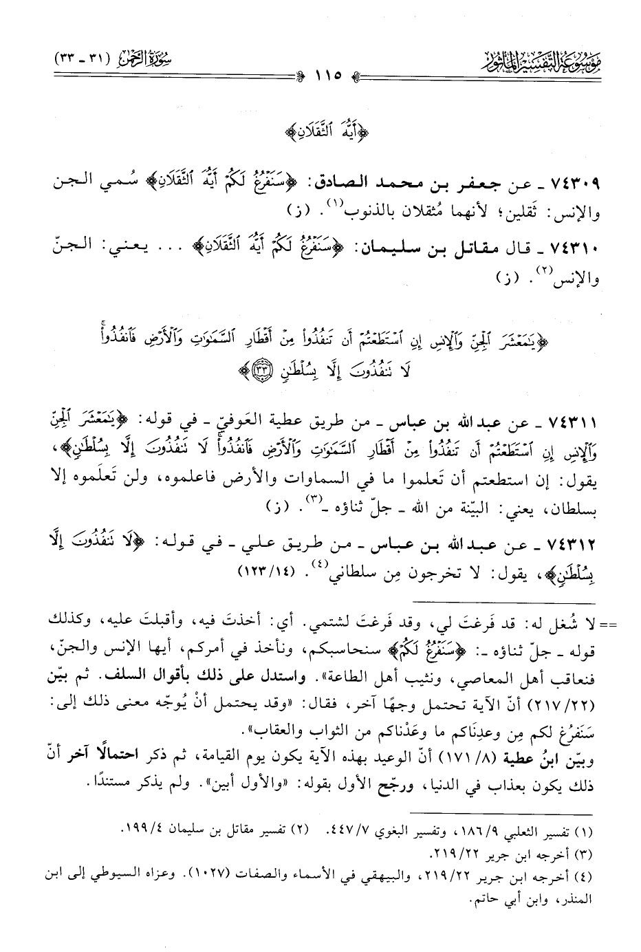 ٧٤٣١٠ - قال مقاتل بن سليمان: {سَنَفْرُغُ لَكُمْ أيُّهَ الثَّقَلانِ} ... يعني: الجنّ والإنس (¬٢). (ز)