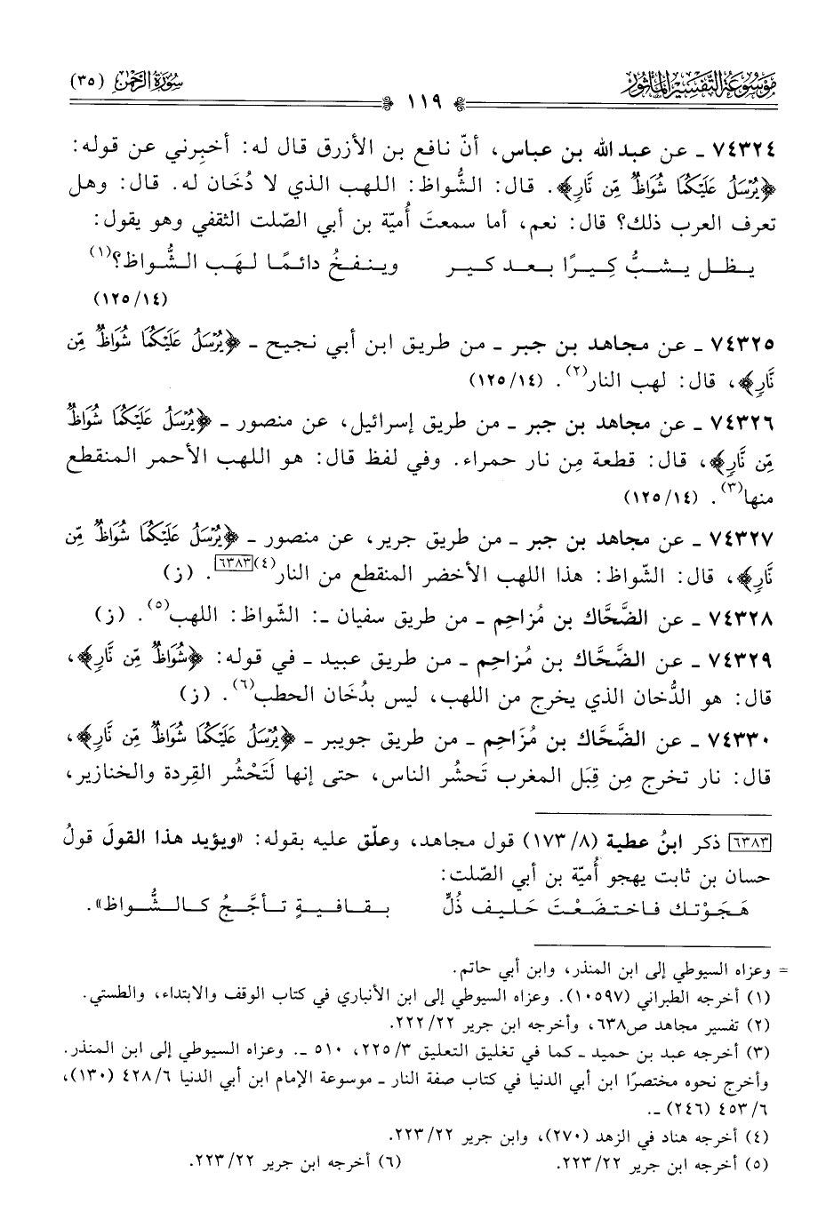 ٧٤٣٢٤ - عن عبد الله بن عباس، أنّ نافع بن الأزرق قال له: أخبِرني عن قوله: {يُرْسَلُ عَلَيْكُما شُواظٌ مِن نارٍ}. قال: الشُّواظ: اللهب الذي لا دُخان له. قال: وهل تعرف العرب ذلك؟ قال: نعم، أما سمعتَ أُميّة بن أبي الصّلت الثقفي وهو يقول: