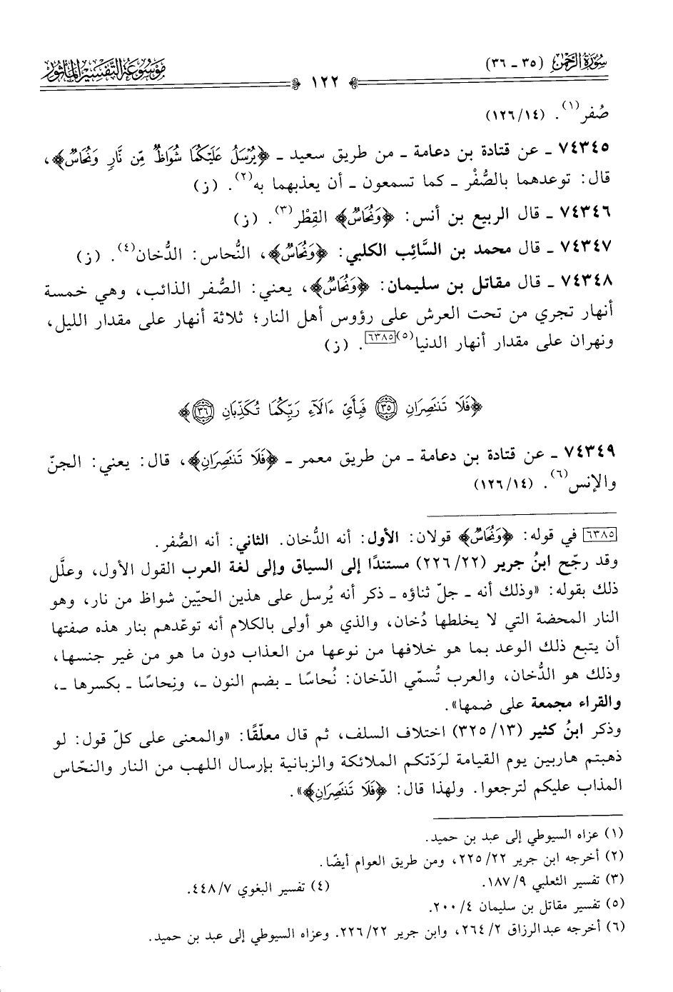 ٧٤٣٤٥ - عن قتادة بن دعامة -من طريق سعيد- {يُرْسَلُ عَلَيْكُما شُواظٌ مِن نارٍ ونُحاسٌ}، قال: توعدهما بالصُّفْر -كما تسمعون- أن يعذبهما به (¬٢). (ز)